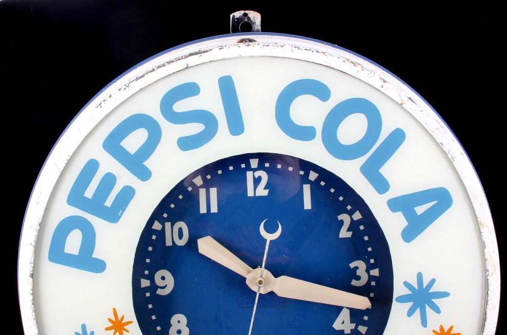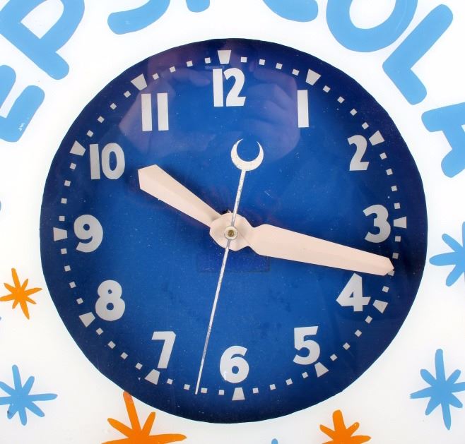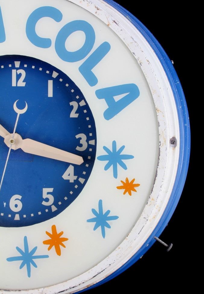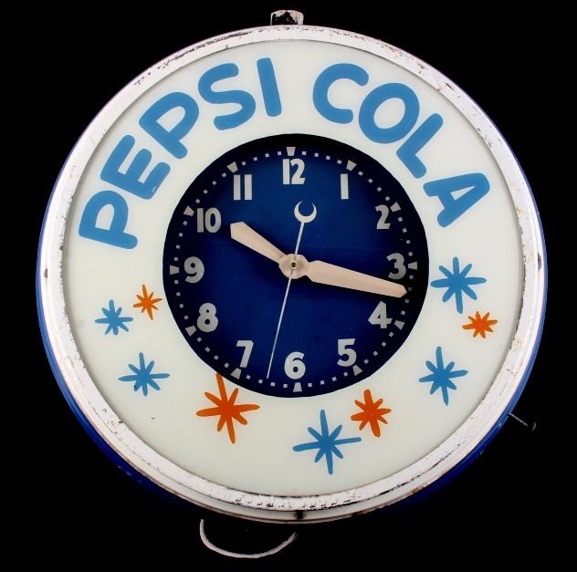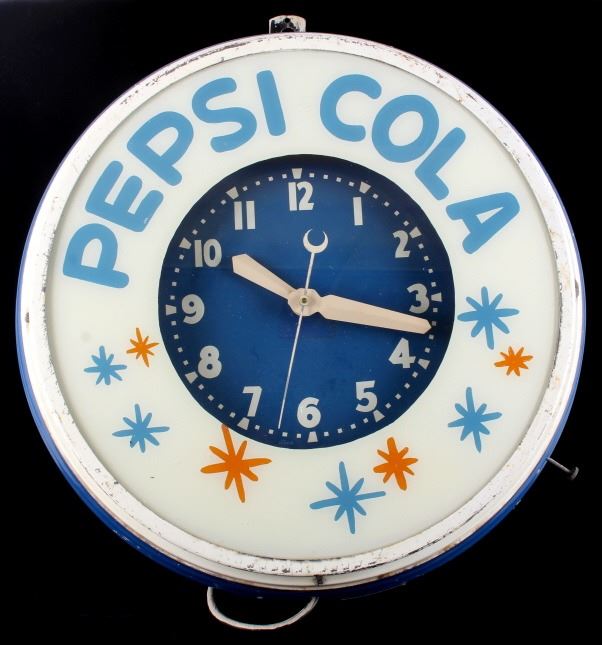 This is a Pepsi-Cola neon lighted clock. The clock features a reverse painted glass face panel with stars and reads "Pepsi-Cola". The clock is in good overall condition. The neon light is slightly dim and the clock movement is not currently working. The clock measures 22" in diameter.