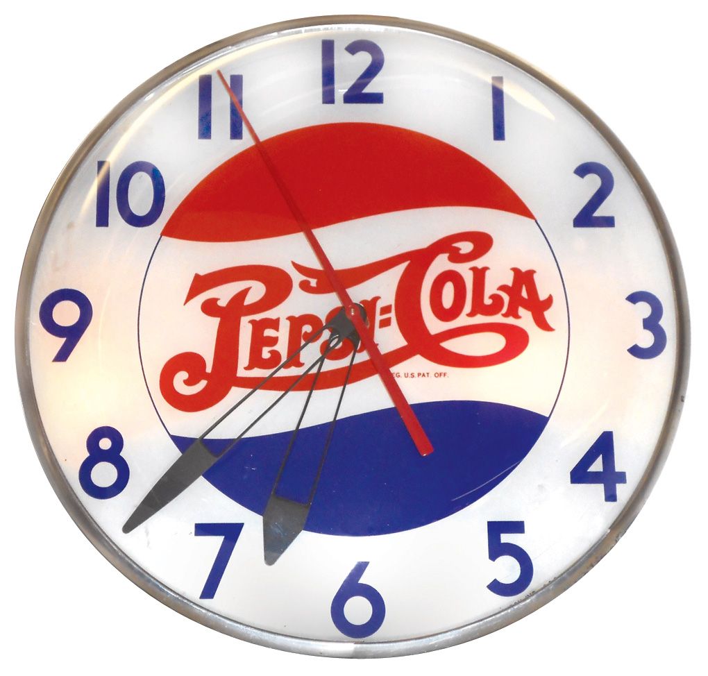 Pepsi-Cola clock, double dot light-up, mfgd by Telechron, Inc., metal case w/glass face, Exc working