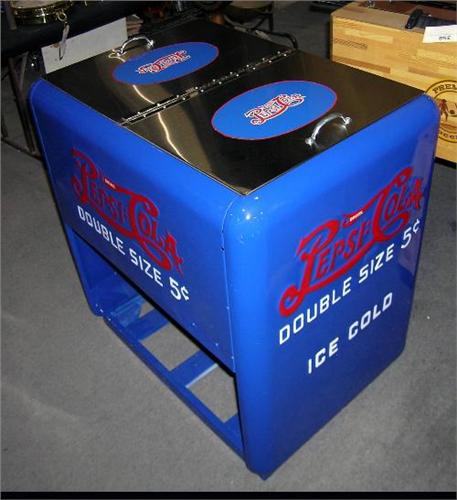 "Pepsi-Cola" large ice chest cooler restored and is a very early example.... it has the double dash and the 5 cent price is embossed in the metal