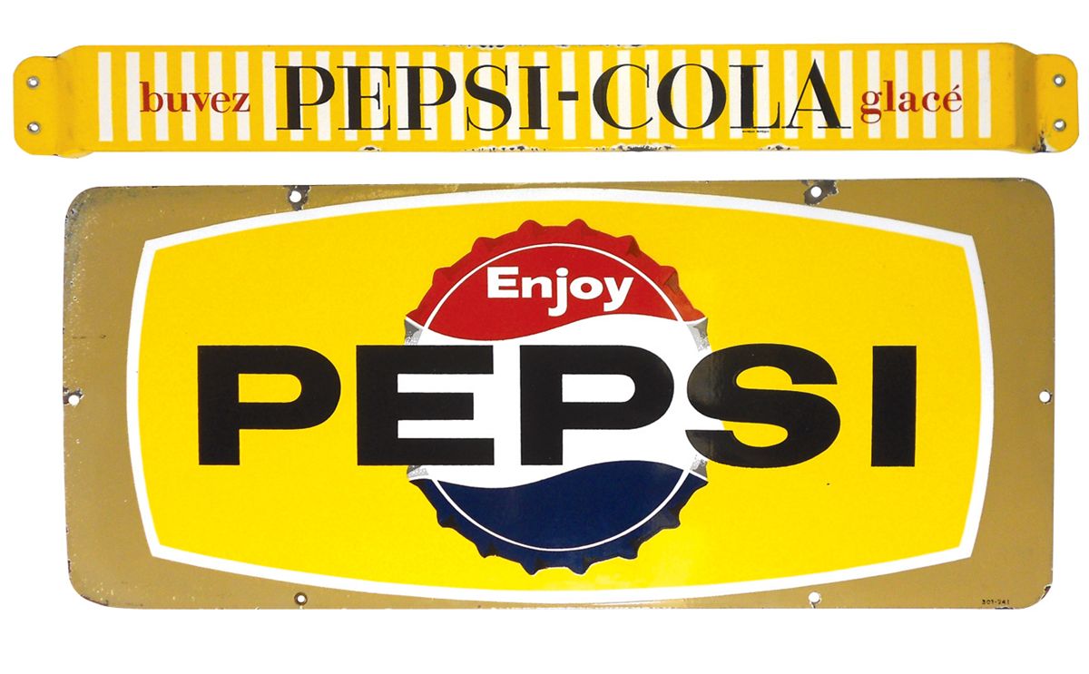 Pepsi-Cola porcelain door push & Enjoy Pepsi porcelain sign, both VG/Exc cond w/minor edge loss, 3.5"H x 32"W & 12.5"H x 29"W.
