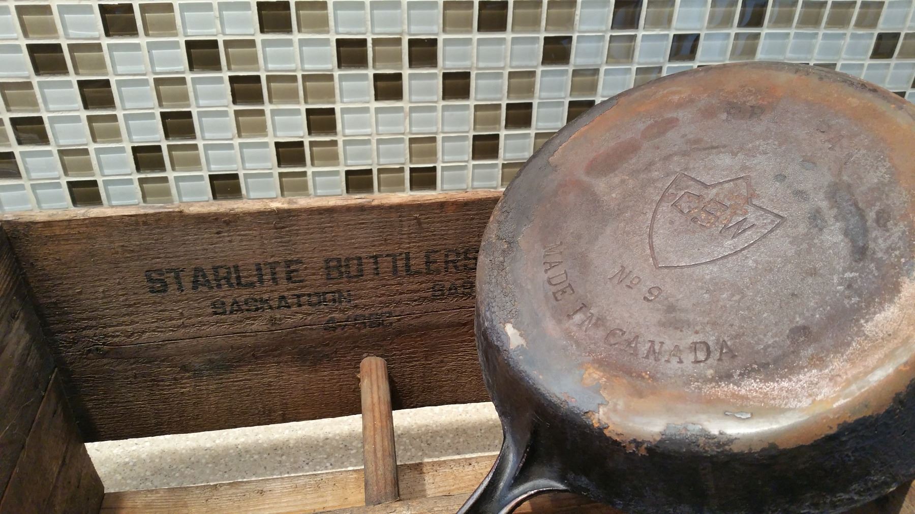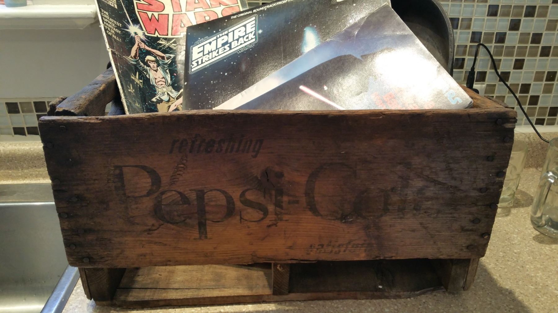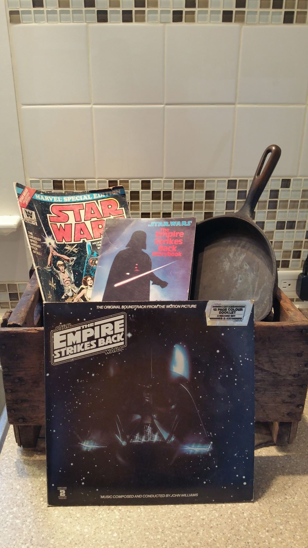 1 Starlite Bottlers Saskatoon Pepsi Crate, 1 Vintage GSW #9 size Heavy Cast Iron Pan, 1 Vintage Marvel Star Wars Comic Book (1977)(Poor Condition), 1 Empire Strikes Back book (1980), and The Empire Strikes Back 2 LP Double Record Soundtrack (1980)(missing color booklet, records in acceptable or better condition)