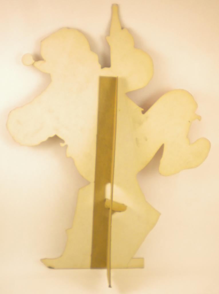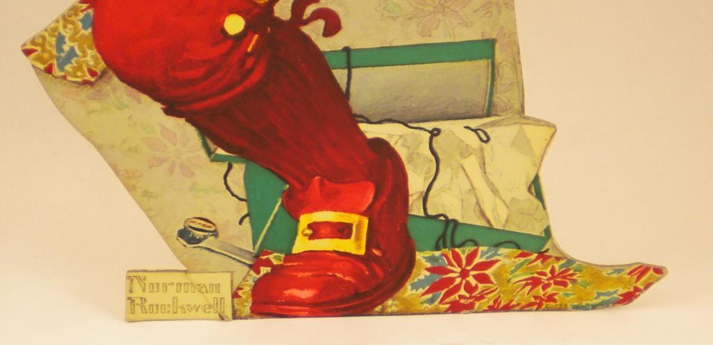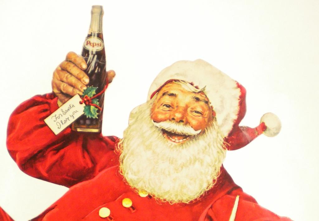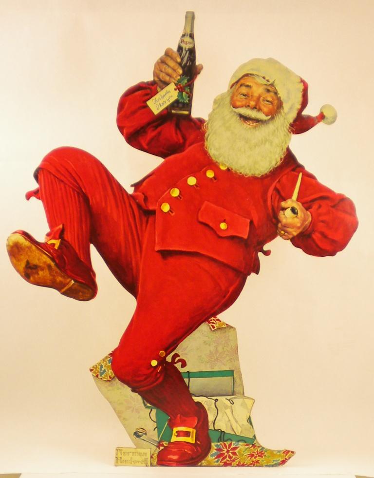 A die-cut Santa by Norman Rockwell advertising Pepsi Cola. It is 20 inches tall x 15 1/2 inches wide. Because it is a cardboard easel-back sign, it has a few creases, but there are no missing pieces.