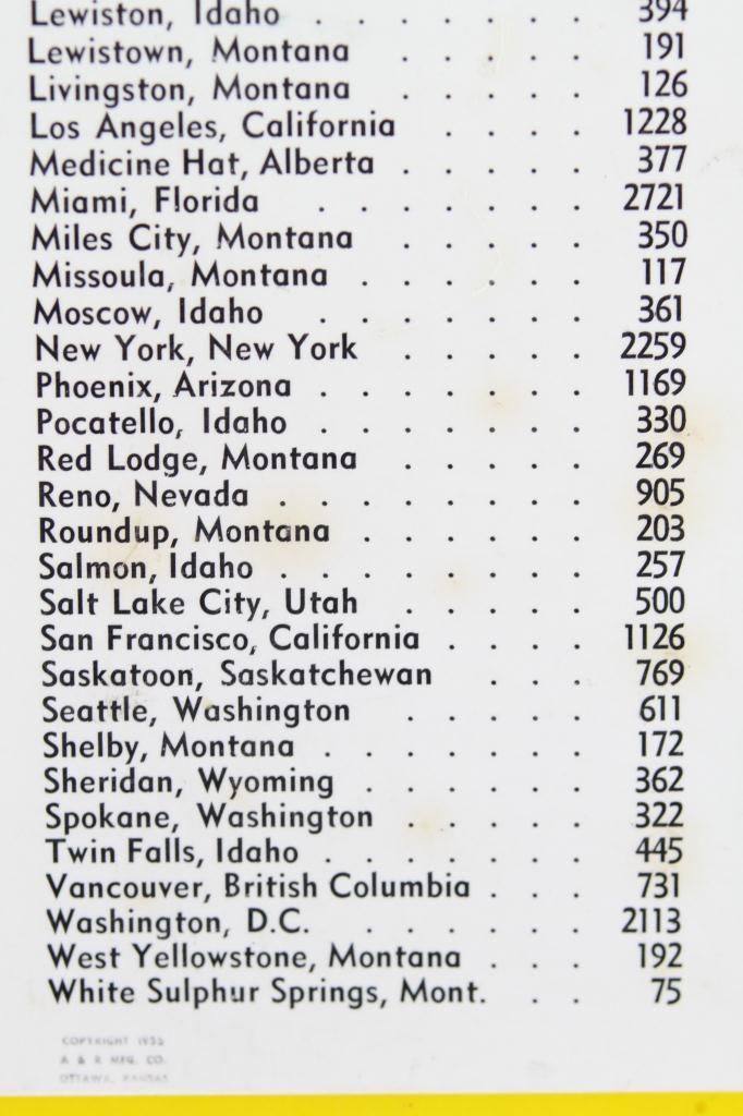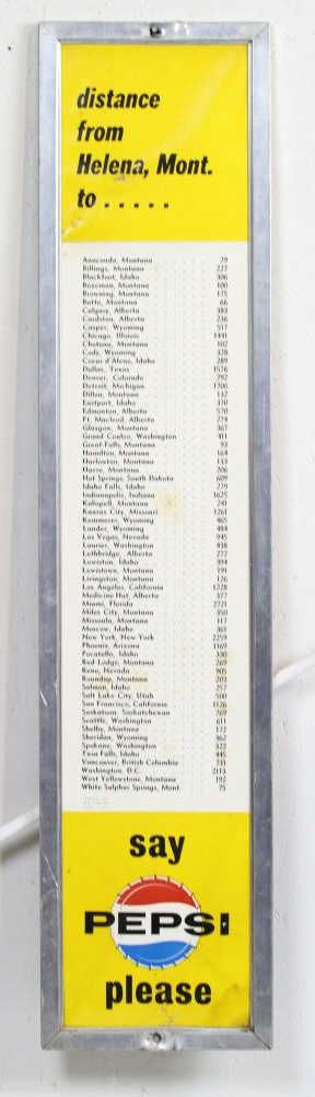 Pepsi Helena Montana Sign This 1955 signs title reads, "distance from Helena, Mont. to...." then shows distances to all Montana and surrounding city's and also includes major USA city's. Bottom reads, "Say Pepsi Please" "Copyright 1955 A & R MFG Co. Ottawa, Kansas." Measures 7"x31".