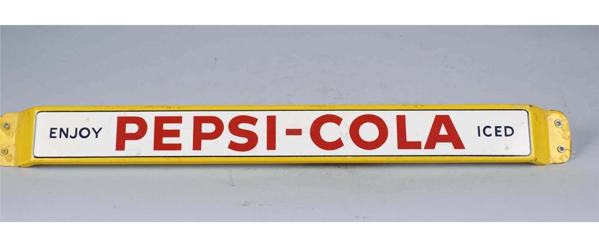 Enjoy Pepsi-Cola Iced ad sign from an old store. Some touch-up around mounting rivets, circa 1950's. Condition (Good). Size 3" x 32"