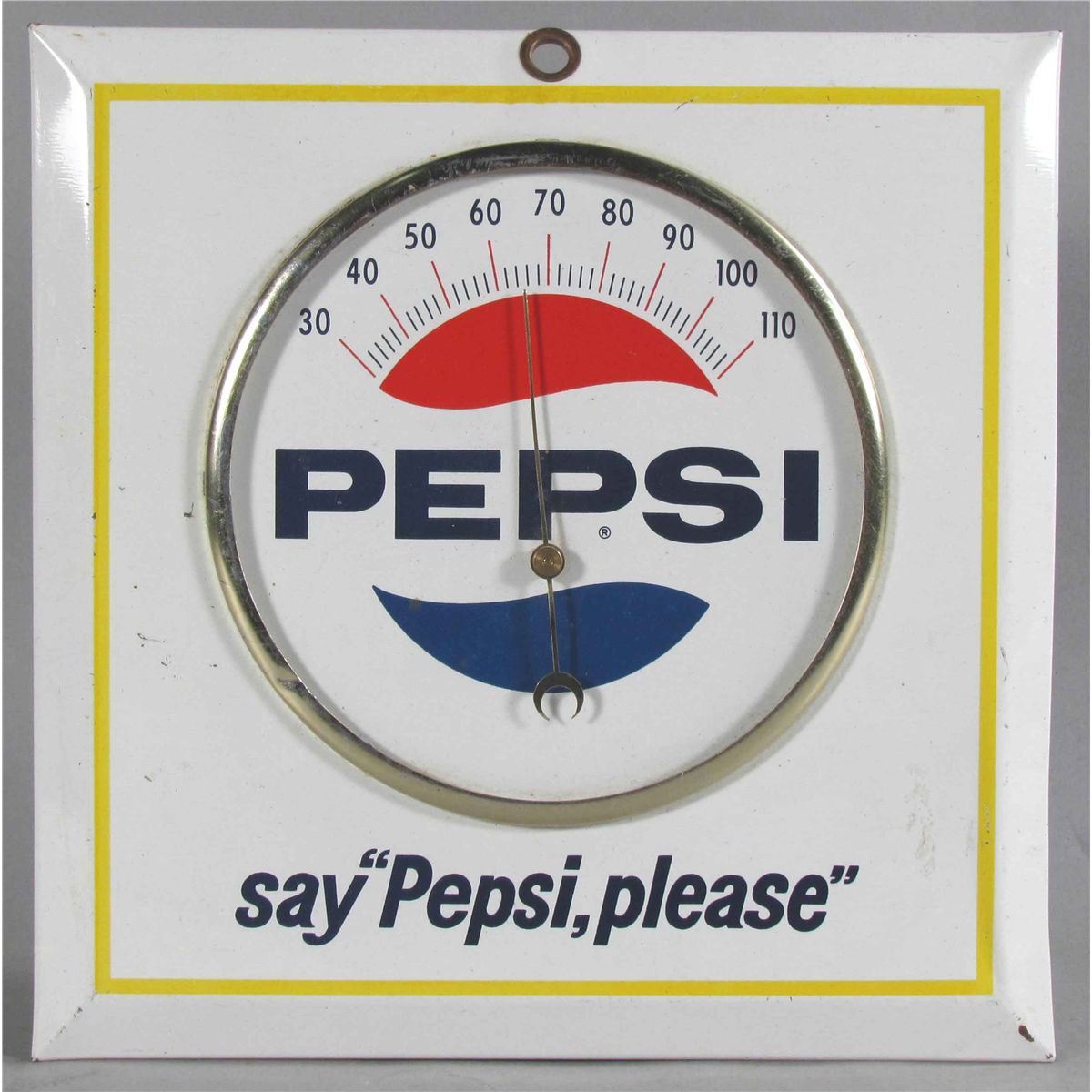 Pepsi Tin Thermometer. A few surface scratches otherwise excellent condition. 8 3/4 inches square. Start Price $30