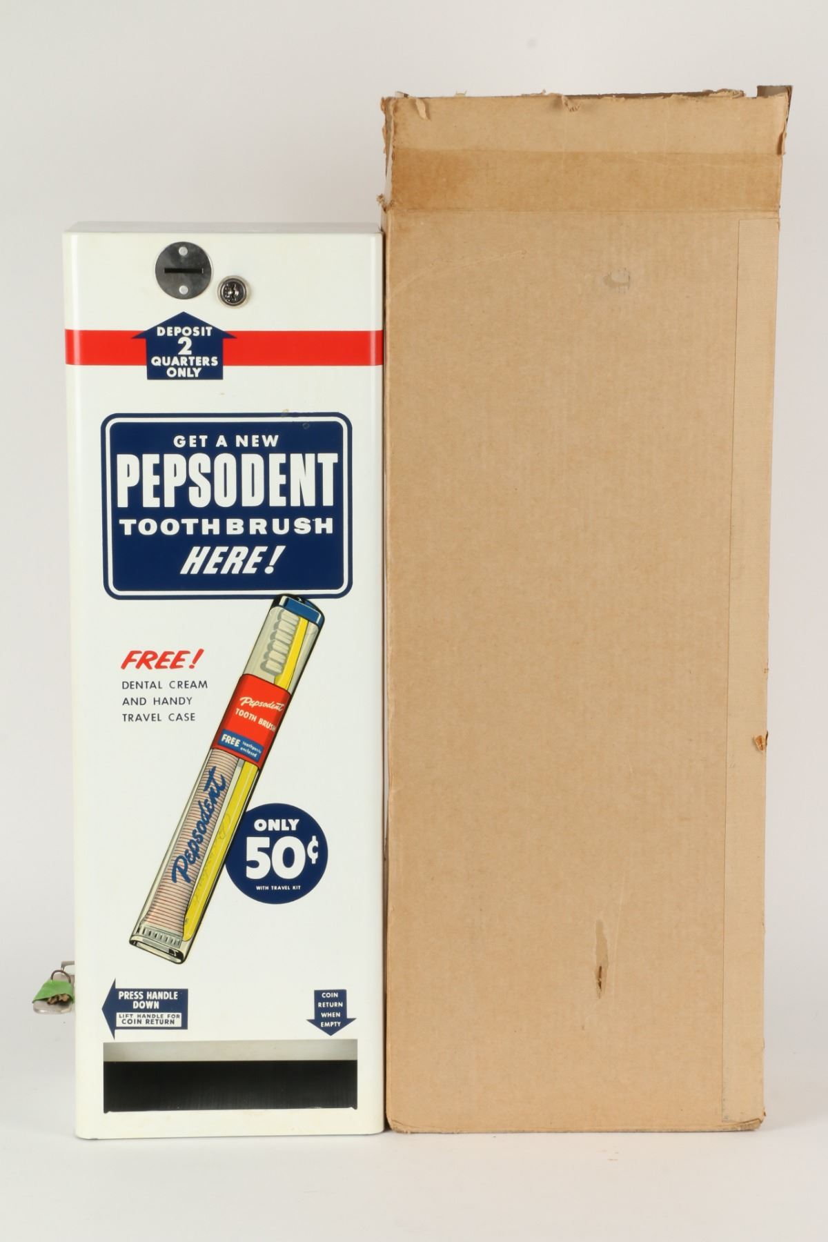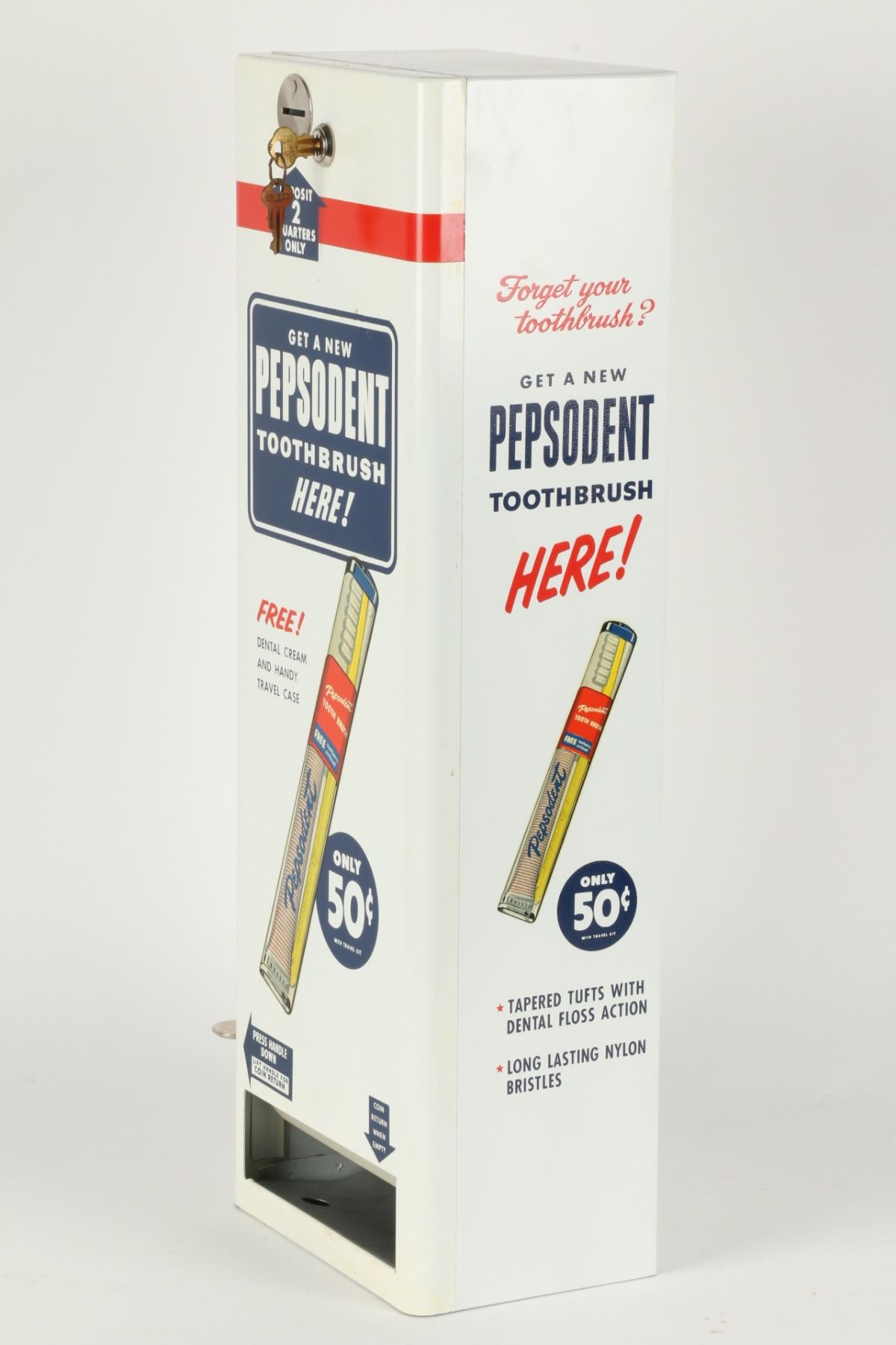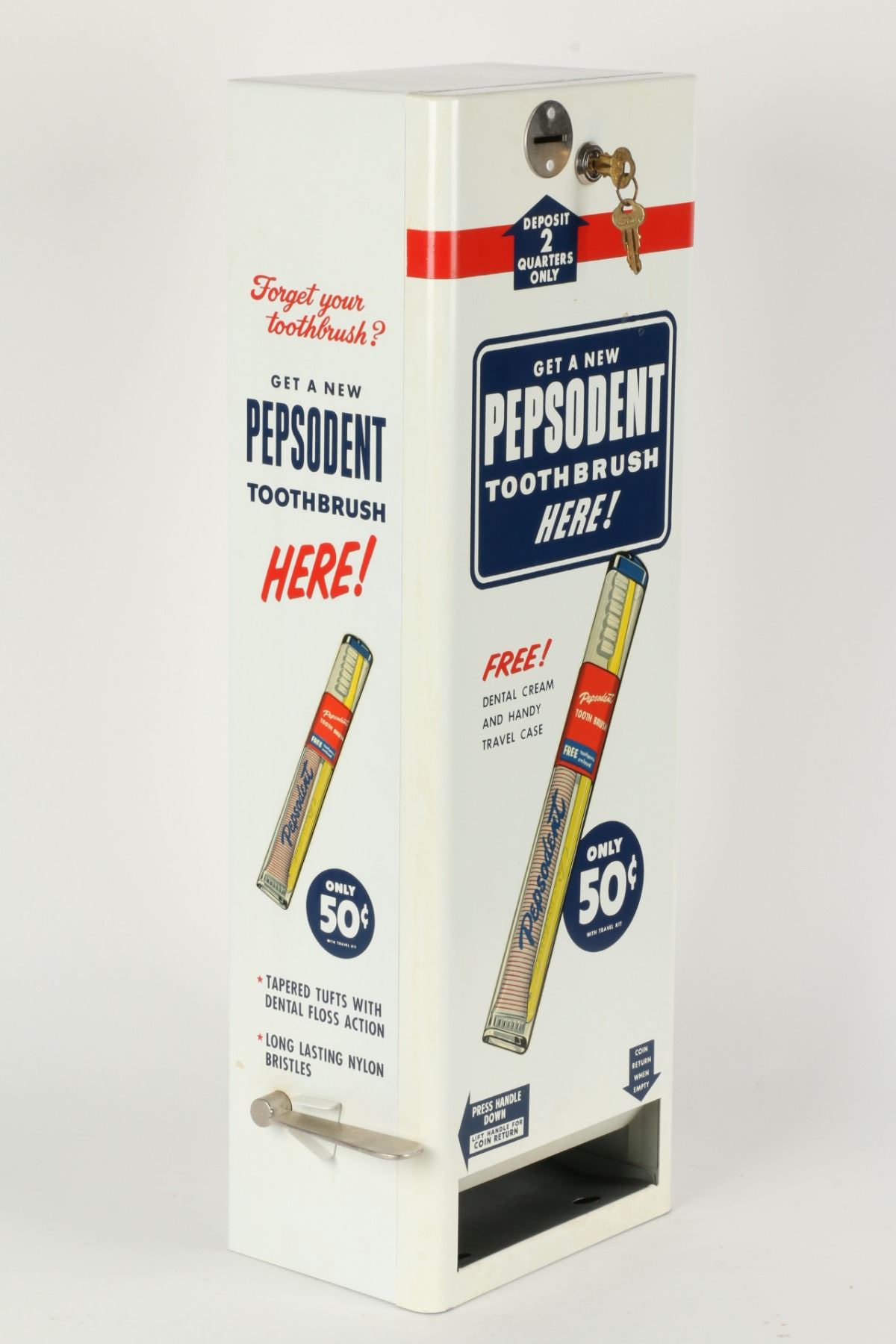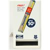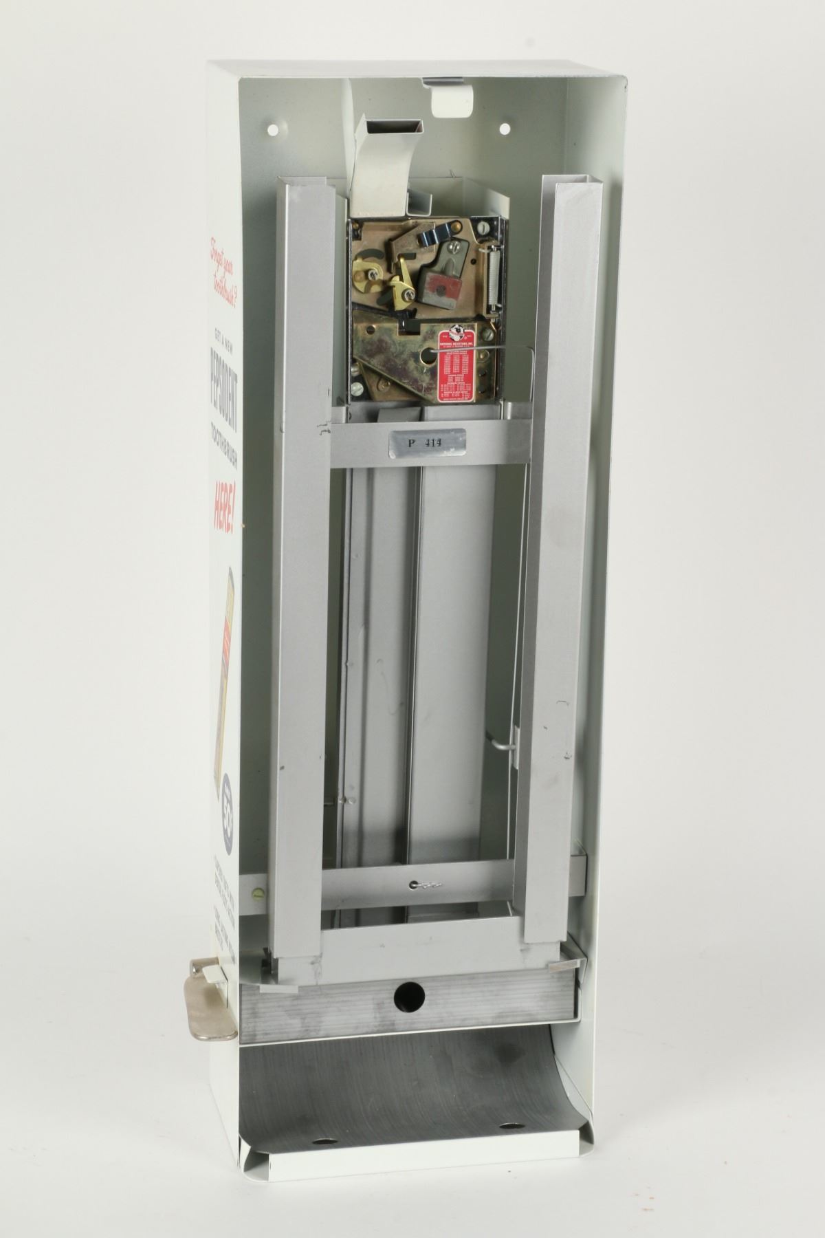 Circa 1950s. New old stock, unused in original packaging. Intended for wall-mounted display, but can also be used on countertop. Includes key. 25" x 8.5" x 6". $200-300.