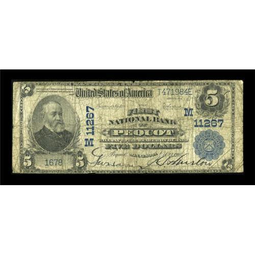 <B>Pequot, MN</B></I> - $5 1902 Plain Back Fr. 606 <B>The First NB</B></I> Ch. # (M)11267<BR> The signatures remain bold on this Crow Wing County issue. This is now the third known note from this one bank town and is from the same source that provided the note consigned to our last auction. That source is now exhausted. This piece is an evenly circulated <B>Very Good.</B></I><BR><BR><b>Shipping:</b> Coins & Currency (<a target="_blank" href="http://www.heritageauctions.com/common/shipping.php">view shipping information</a>)