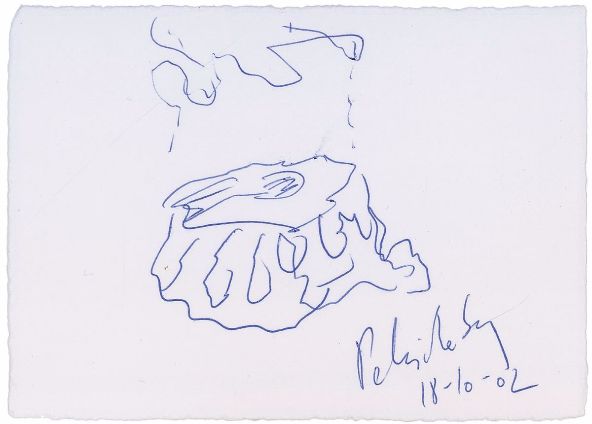Acclaimed Danish painter, poet, filmmaker, and sculptor (born 1938). Original signed ballpoint sketch of a tree stump on a white 6 x 4 card dated October 18, 2002. In fine condition.
