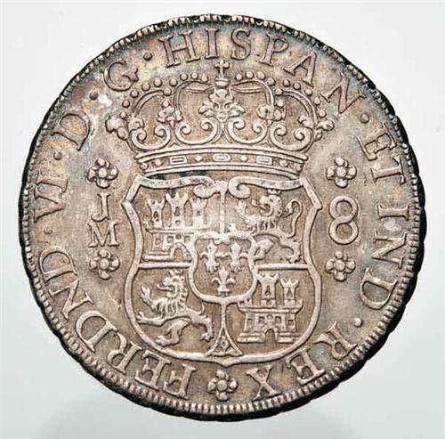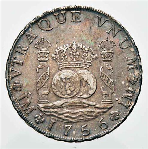 Oltremare - Perù - Dominazione spagnola - Ferdinando VI (1746-1759) - 8 Reali 1756 - Metallo: Ag - Zecca: Lima - Diritto: stemma coronato - Rovescio: i due emisferi affiancati e sovrastati da una corona fra le colonne d'Ercole coronate - gr. 27,03 - Patina di medagliere
