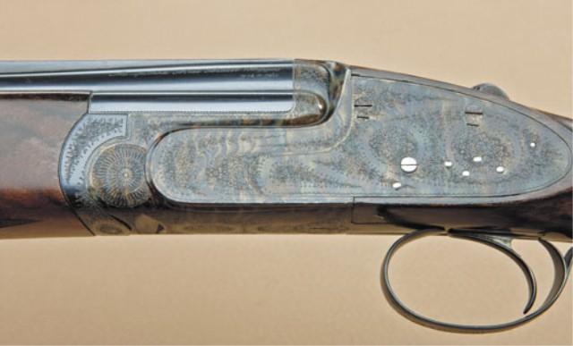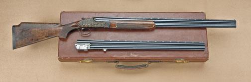 Perazzi Grand Premio, Grade 2 barrel, over/under 12ga shotgun, serial #5447, full sidelock, highly engraved, select burl wood checkered stock, refer Perazzi Shotguns page 29 Charles C. Lippard, One of only two imported to the United States in 196 With original Perazzi maker’s specification papers and two extra firing pins. The gun shows two sets of barrels. Barrel #1 measures 26-7/8”, choked Cylinder over Cylinder. Shows a ventilated low-profile rib and gold-inlaid “1” on breech. Barrel #2 barrel measures 30” and is choked Extra Full over Improved Modified and gold inlaid “2” at the breech. The gun shows single trigger, auto ejectors, trap style stock with pistol grip measuring 14-1/8” to the end of the wood, 14-3/4” to the end of the added hard-rubber pad. The gun remains in fine to excellent condition showing some use, approx. 95-98% original blue, excellent bores. Stocks show a satin type European type finish and just a couple of marks, are near excellent. The frame is beautifully engraved in bank notes and floral designs. The bottom of the frame is engraved “MAP”. 99% plus original case hardening, 98-99% original blue on triggerguard. Case shows some slight discoloration and scuffs