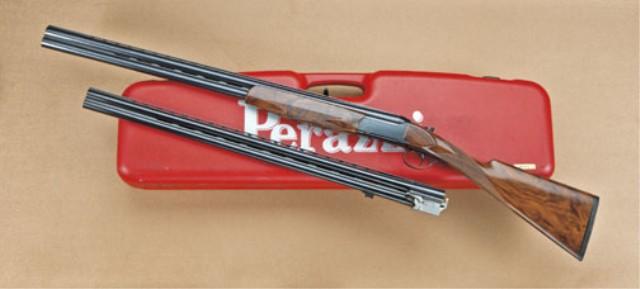 Perazzi MX5 model, 20ga and 12ga two-barrel set, in original carrying case, serial #114014. The gun shows English-style straight grip, select checkered wood stock with thin line recoil pad. Single trigger, auto ejectors. The 12ga barrels are 29-1/2”, and also the 20ga barrels. Both serial numbered to match, with screw in choke set. Near fine used condition, 97-99%. Some normal firing and use. These two-barrel sets are unusual and expensive to replace. Est: $4,000 - $8,000