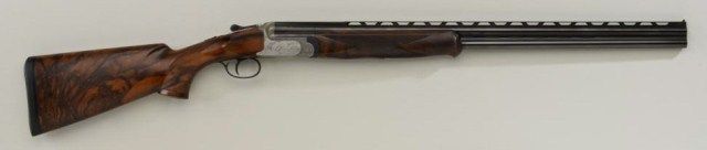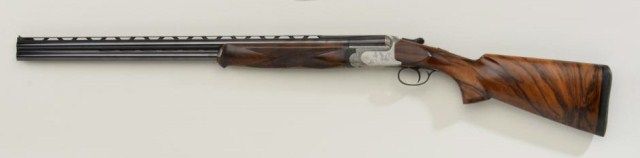 Perazzi S.C.O. grade four-barrel set in 12, 20, 28 and 410 gauge, beautifully engraved but not signed and we attribute the engraving to Galeazzi who was Robert Petersen’s favorite engraver; #54153. The left side ofthe frame shows flushing game birds, eagle on branch at bottom of frame and ducks over water on right surrounded by finely cut European scrolls; the gun is nicely stocked in select burl walnut and the gun is chokedSkeet and Skeet in all four barrels, each 27-1/2” in length with fore end for every barrel. The gun is in fine to near excellent condition showing some minor use; 97-99% finish, some minor scratches in wood. Thestock measures 14-1/2” to end of factory leather covered pad with a 2-3/4” drop at heel and 1-3/4” drop at comb with a ¼” cast off at heel and 1/8” cast off at toe. The gun is contained within a high quality Italianluggage style case with Perazzi literature and stock wrench. The case is very good + with some scuffs and traveling marks; factory replacement estimated at $35,000 + depending on exchange rate. Robert E. Petersen estate.