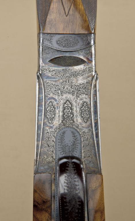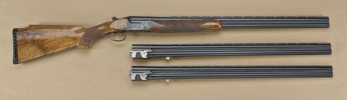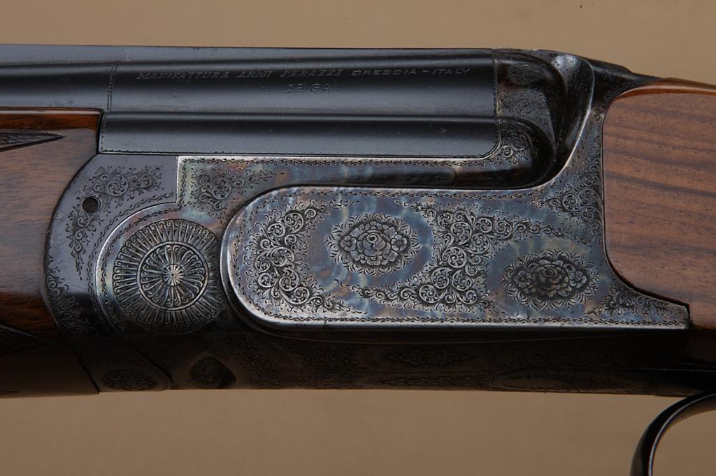 Perazzi SC3 factory three-barrel set, 12ga, serial #32285. Barrel #1 measures approx. 29-1/2”, is choked “Modified” over “Improved Cylinder”. Shows a low-rise hand-filed concave rib, matte blue finish, and barrelretains approx. 98-99% of this finish and shows just some use. Barrel #2 shows identical features, choked “Improved Modified” over “Modified”. Showing 92-96% original finish, light erosion, evidence ofuse and need cleaning. Barrel #3 matches length and rib configurations, choked “Improved Cylinder” over “Improved Cylinder”, 97-98% original finish. Barrels are all serial numbered to match and fitted to oneforend, which is included. The gun shows an engraved an case-hardened frame with good-quality scroll and rosette engraving, typical of Perazzi. The stock measures 14-1/4” to the end of the wood, nearly 15” to the end of the factory hard-rubber pad which is starting to deteriorate and needs replacement. The gun is nicely stocks in high-quality figured walnut, showing close checkering, raised cheek piece, and high comb