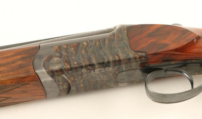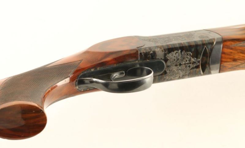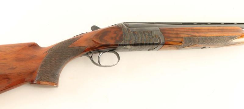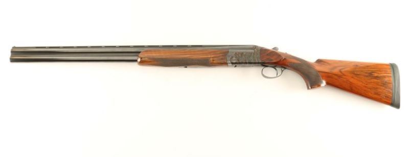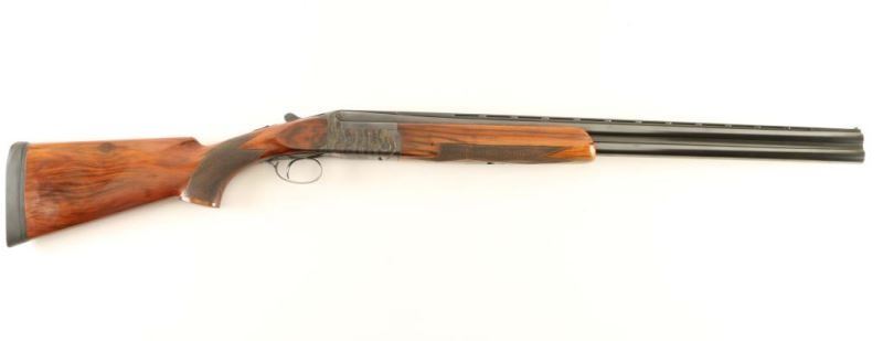 Engraved high quality Italian made over/under double barrel skeet shotgun chambered for 2 3/4" 12 Gauge shells, circa 1970. Imported by Ithaca Gun Company of Ithaca, New York with import marks on the top barrel. Features blued 26 3/4" barrels with a wide ventilated sighting rib, white bead front sight, silver bead mid-sight, automatic ejectors, finely floral scroll engraved receiver with case hardened finish, removable single trigger, checkered top lever, sliding tang safety, fancy checkered figured wood forearm and pistol grip shoulder stock with Kick Eez rubber recoil pad & 14 1/4" LOP. Shotgun exhibits approximately 93% of it's original finish showing some carrying wear on the underside of the receiver, edge/handling wear on the trigger guard and slide wear under the safety. Action is crisp, bores are pristine and wood stocks are very good with semi-worn checkering & small blemishes. Condition is near excellent. ***Modern Firearm***