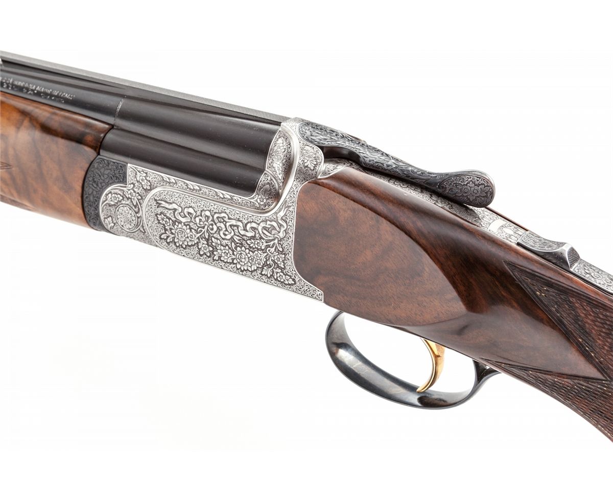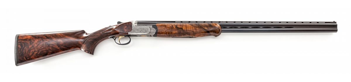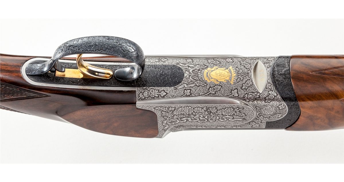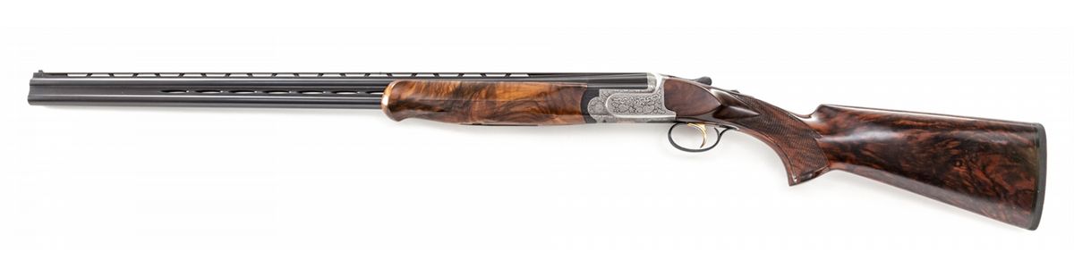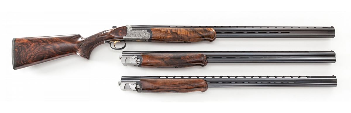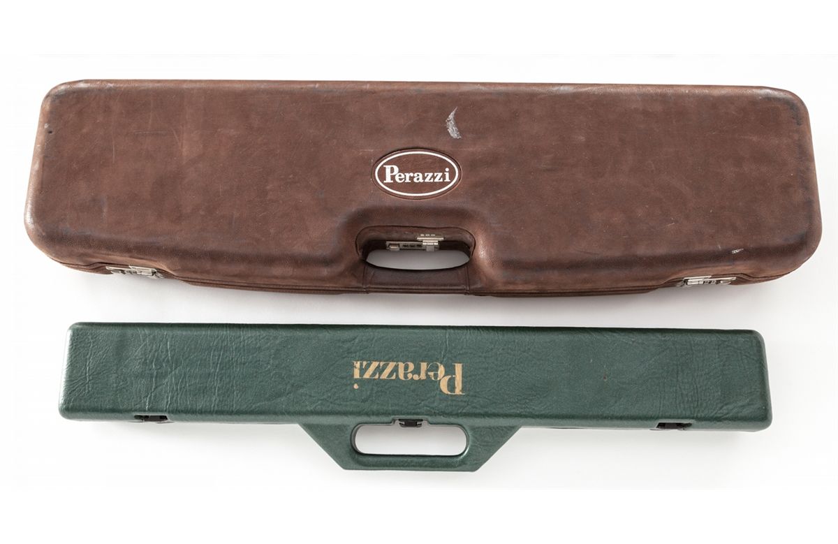 Perazzi SCO Model Two-Barrel Over/Under Shotgun Set, with later added .410 barrel, #90479, with 12 ga. 29-1/2'' barrels with Briley choke tubes, as well as 28 ga. 28'' barrels with Briley choke tubes, both numbered to the gun; later added .410 barrel has been fitted by Perazzi and numbered to match, 29-1/2'', and also utilizes Briley choke tubes. Standard SCO Model medium relief engraving additionally features gold inlay of Perazzi shield to bottom of frame, with work being executed by Badillini. Shotgun remains complete with choke tubes, tools, oiler, and instructions, in Perazzi case. Condition is excellent showing only minor pressure marks to stock from handling. Triggerguard retains 99% of original blue with wear at high edges. Gold-plated trigger shows some thinning. Length of pull to end of pad: 14-5/8''. Est.: $18,000-$24,000. (Modern)
