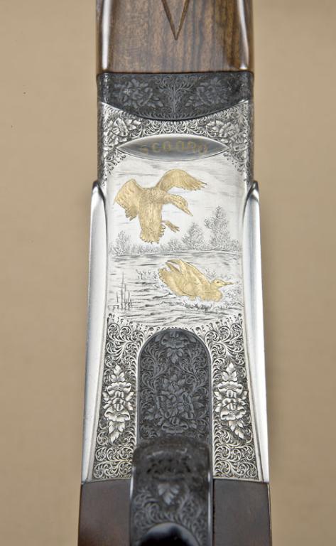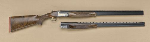 Perazzi SCO factory gold-inlaid two-barrel set in 410 and 28ga. Serial #10112. The gun is beautifully engraved and gold inlaid signed by Galeazzi, and also marked “SCO Oro” (gold) on bottom of frame, withhighest-quality engraved scrollwork, select walnut stock, schnabel type European forend, squared Perazzi type elongated pistol grip. The barrels measure 27-5/8”, showing ventilated ribs, single trigger, autoejectors. 410 barrels are choked “Cylinder” over “Cylinder”. 28ga barrels are choked “Modified” over “Modified”. The gun remains in fine to excellent original condition showing limited firing and slight use only.The stock shows a couple of minor handling marks. The gun is virtually excellent overall, 98-99% plus. In Perazzi case with tool and original paperwork mentioning the stock measures “15-1/6” from the trigger tothe end of the pad, 1-1/2” drop at comb, 2” drop at heel. Perazzi small bores are seldom encountered, especially in the Oro (gold) grade. From the Robert Petersen collection. Est: $15,000 - $30,000