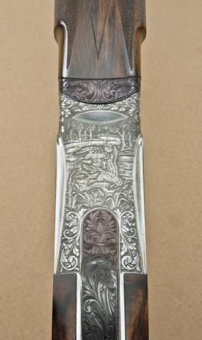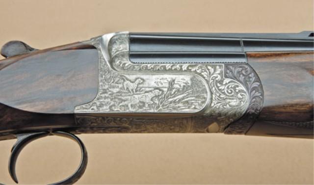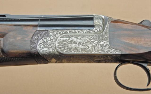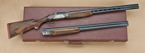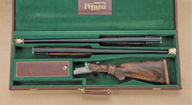 Perazzi custom upgraded over/under two-barrel set, 12ga. Showing grip cap with name “G. Hoenig Boise Idaho” on face, who we believe restocked and upgraded this Perazzi, serial #32893. The gun shows one 29-1/8” set of over/under barrels choked Improved Modified over Modified with ventilated rib, auto ejector. The extra barrel measures 28-1/4”. Barrels are split with high raised rib, choked Modified over Improved Cylinder. Frame has been reconfigured and beautifully engraved in game scenes with hunting dogs and birds. The mounts engraved to match and two forends. Single trigger. The stock measures 14-1/4” to the end of the wood, 15” to the end of the hard-rubber pad. The gun is beautifully stocked in burled walnut with fine checkering, elongated pistol grip, and squared sides and finest quality workmanship with a beautiful fit. Mr. Hoenig is considered one of America’s top gunsmiths and Robert Petersen favored his work. In Perazzi luggage case. From the Robert Petersen Estate. Est: $5,000 - $10,000