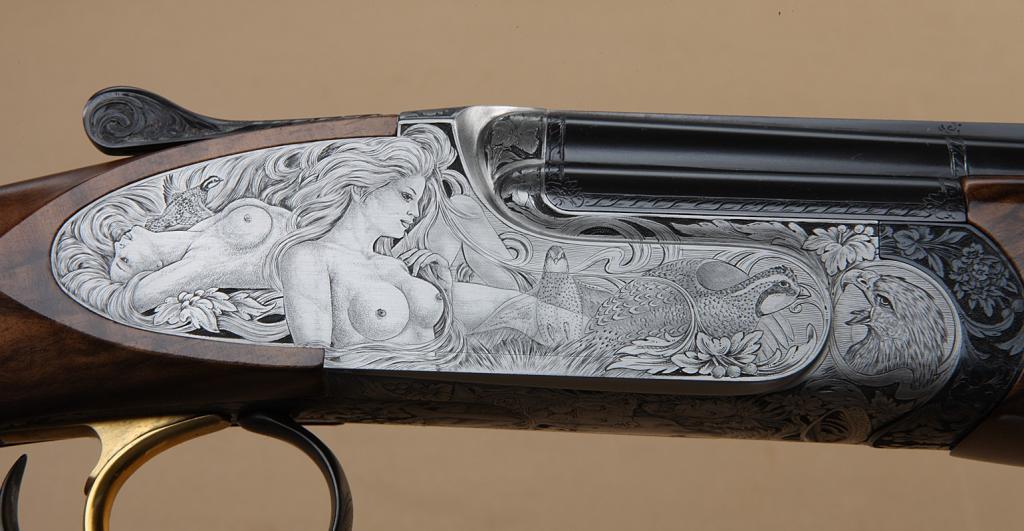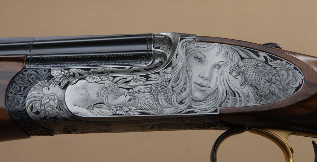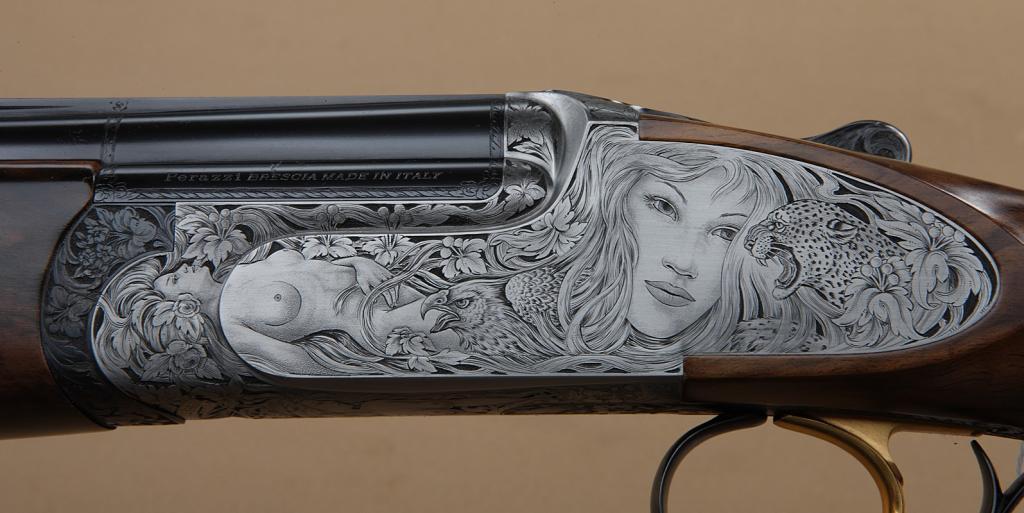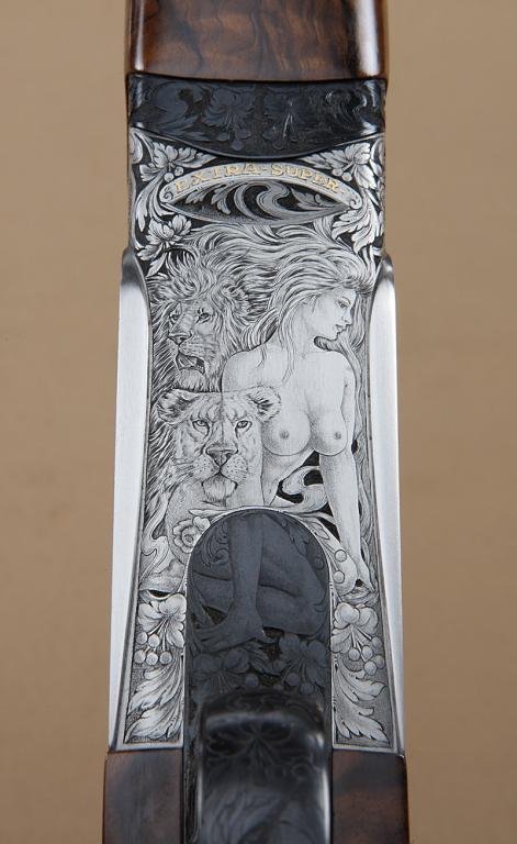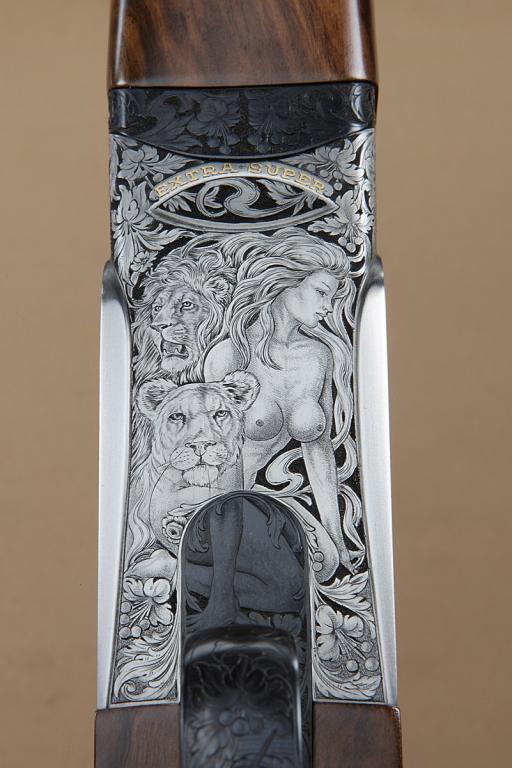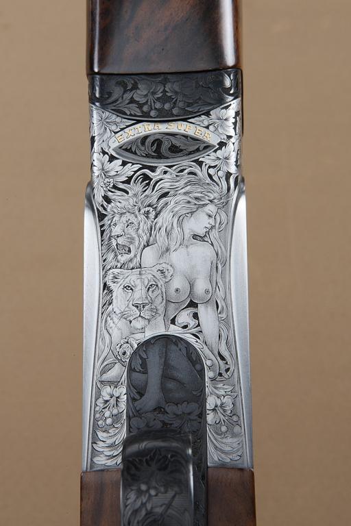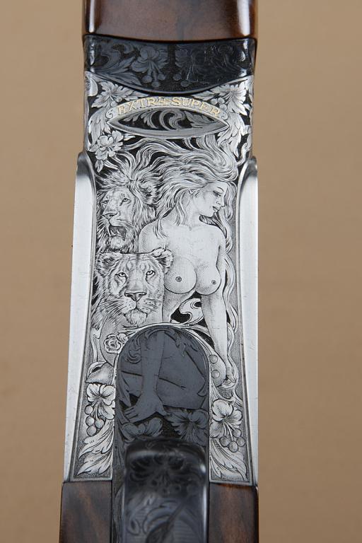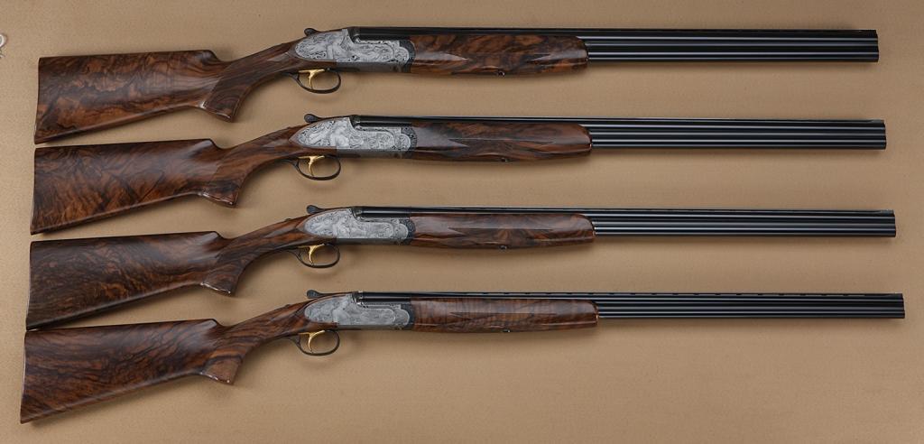 Perazzi extra super grade 4-gun garniture, all high-art engraved by Galeazzi showing engraving of nude ladies, lions, eagles, leopards, and floral accents. Numbered in Gold on levers, “1”, “2”, “3”, and “4”.Gun #1 is frame #117596 and shows a 27-13/16” barrel, 12ga, choked “Full” over “Modified”. Low rise ventilated hand-filed rib. Gun shows a deluxe burl wood stock, finely checkered, with schnable forend and Perazzistyle pistol grip. The stock measures 14-7/8” to the end of the checkered wood but. The engraving is of superb quality and shows the masterful work this engraver is world-famous for. The gun shows test-firing only and isfine to excellent condition. Very little to almost no use. Gun #2 is frame #117597 and shows 27-13/16“, 20ga barrels, choked “Improved Modified” over “Improved Cylinder”, low rise ventilatedhand-filed rib, engraved en suite. Stock to match, also fine to excellent condition, only possible test-firing, fine to excellent condition. Guns #1 and #2 are in their original Perazzi carrying case.