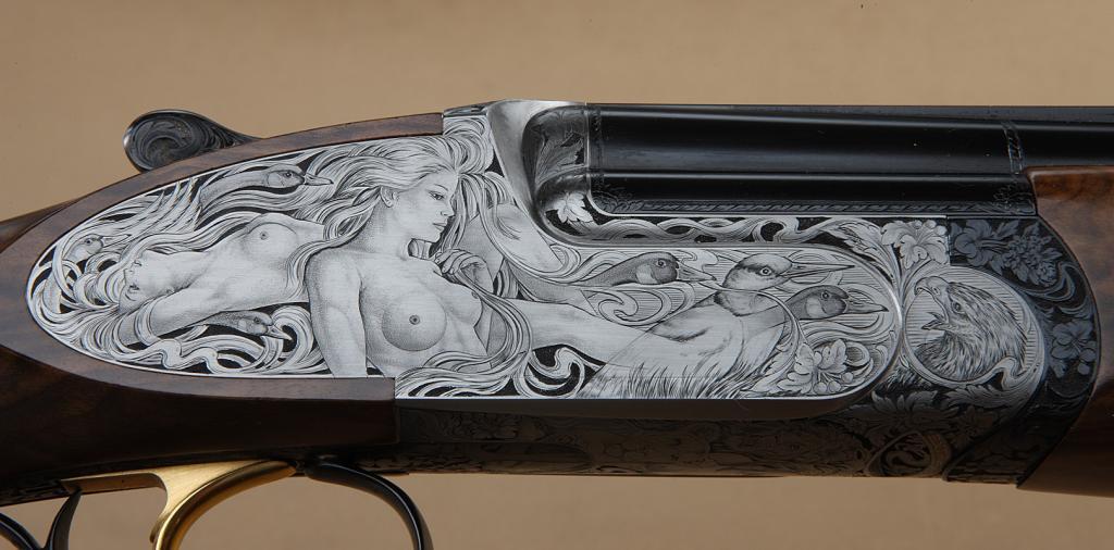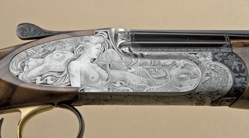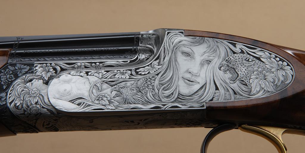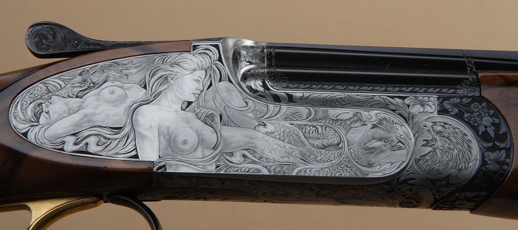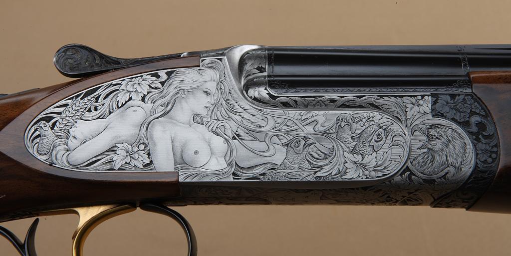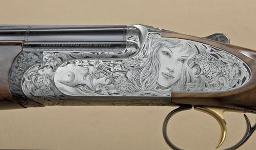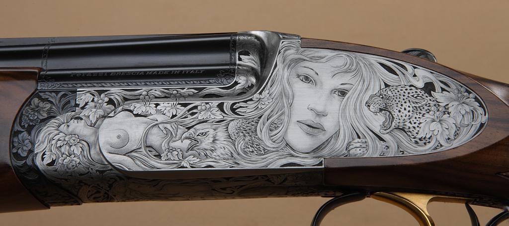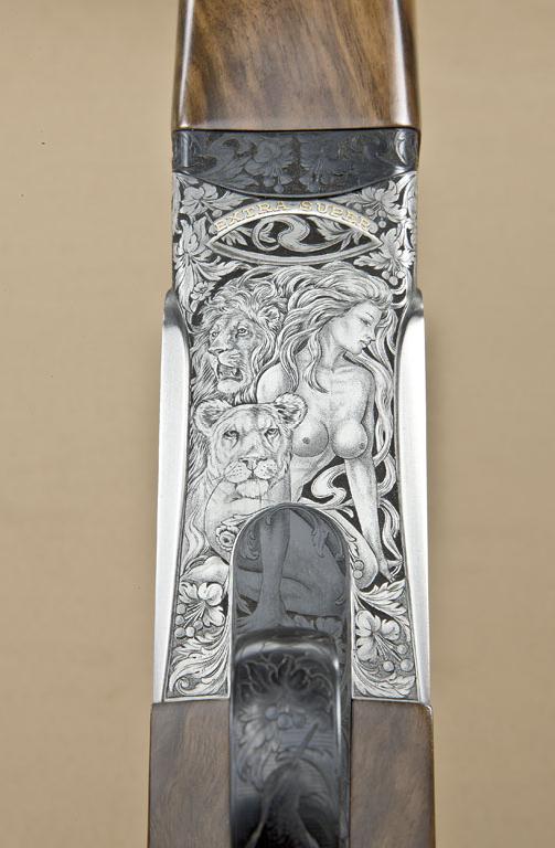 Perazzi extra super grade 4-gun garniture, all high-art engraved by Galeazzi showing engraving of nude ladies, lions, eagles, leopards, and floral accents. Numbered in Gold on levers, “1”, “2”, “3”, and “4”.Gun #1 is frame #117596 and shows a 27-13/16” barrel, 12ga, choked “Full” over “Modified”. Low rise ventilated hand-filed rib. Gun shows a deluxe burl wood stock, finely checkered, with schnable forend and Perazzistyle pistol grip. The stock measures 14-7/8” to the end of the checkered wood but. The engraving is of superb quality and shows the masterful work this engraver is world-famous for. The gun shows test-firing only and isfine to excellent condition. Very little to almost no use. Gun #2 is frame #117597 and shows 27-13/16“, 20ga barrels, choked “Improved Modified” over “Improved Cylinder”, low rise ventilatedhand-filed rib, engraved en suite. Stock to match, also fine to excellent condition, only possible test-firing, fine to excellent condition. Guns #1 and #2 are in their original Perazzi carrying case.
