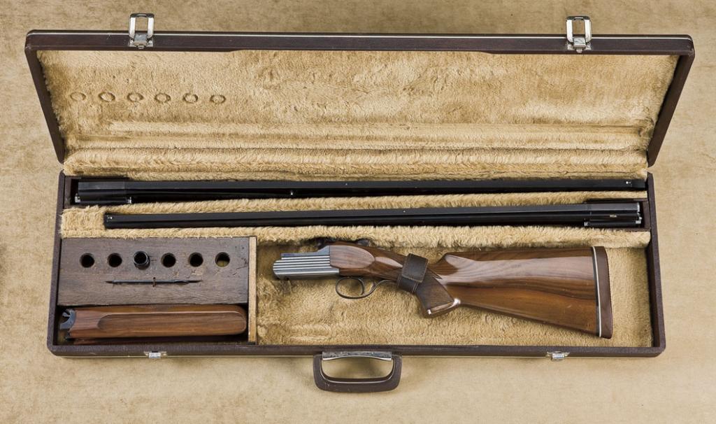 Perazzi mfg. 12 gauge Competition Trap Shotgun with extra set of matching barrels and luggage case, serial #102950. The gun is equipped with a 33 5/8” single barrel with extra high factory rib and an over/under set of 31 5/8” barrels with standard Perazzi rib. The barrels are fitted for removable chokes of which 4 are included along with a removal tube. The stock measures 14 to end of wood and 14 7/8” to end of European style rubber pad. The condition is very good to near fine with 97-98% plus original blue, some minor marks in wood and normal use. Est. $4,500-9,000