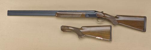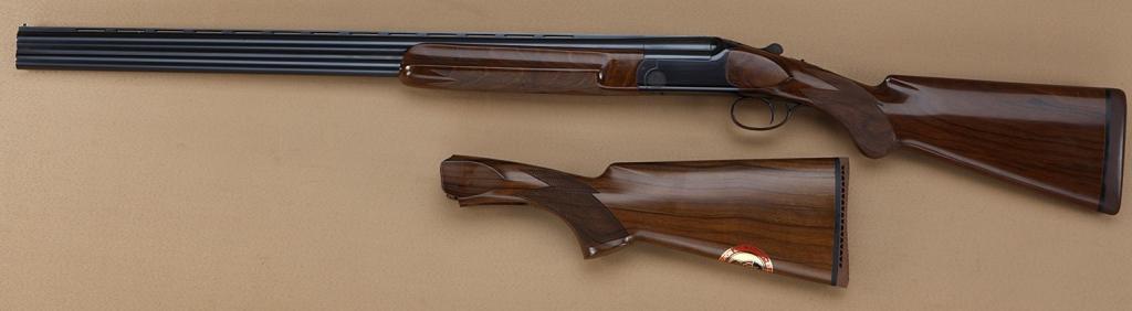 Perazzi pigeon gun, 12ga over/under, early manufacture, cased with extra stock and accessories, serial #31940. The gun shows 28” barrels, choked “Improved Cylinder” over “Cylinder” with a hand-filed ventilated rib,single trigger, auto ejector, rounded pistol grip, blued finish, checkered select straight grain walnut stocks. The gun measures 13-3/4” to the end of the wood, 14-5/8” to the end of the hard rubber European type pad. The barrels show no importers, only Perazzi markings, and remain in near fine condition with 96-98% original blue. The frame shows 96-98% blue with some slight natural toning from age. The stocks are very good plus tonear fine with some minor handling and use marks, and some slight crazing to the varnish and only limited use. The box contains an extra Perazzi stock fitted for this gun, showing squared pistol grip with flat bottom, stock measures approx. 14” to the end of the wood, 14-3/4” to the end of the pad from our judgment of where the trigger would fall. The stock is in very good condition, showing minor use. The gun is contained within a