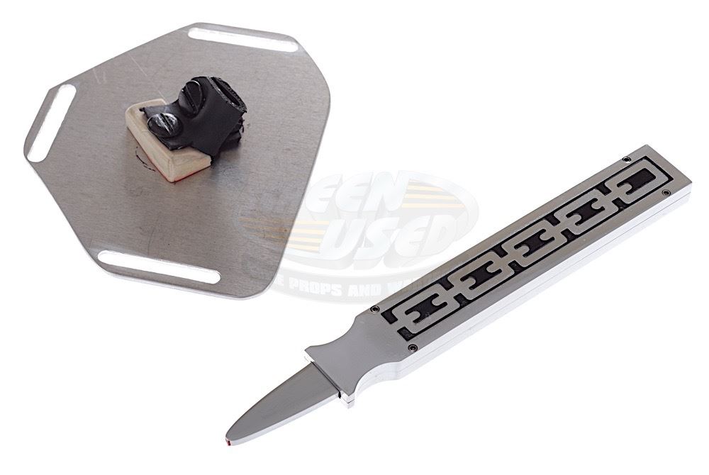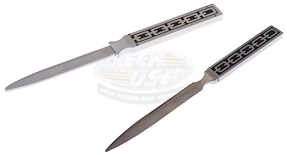 (ABC, 2012-2015) This set of prop letter openers were acquired by the production for use by various actors and as set dressing in the season two episode titled "Asylum". Both openers are made of metal, one is a standard solid version and one features a custom retractable blade for use in the effects stabbing scene. Included with the effects stabbing opener is a metal stabbing plate and nylon straps that were worn under the shirt of the actor being stabbed. The full solid opener measures 8.75" in length. The effects stabbing opener measures 9" in length.
