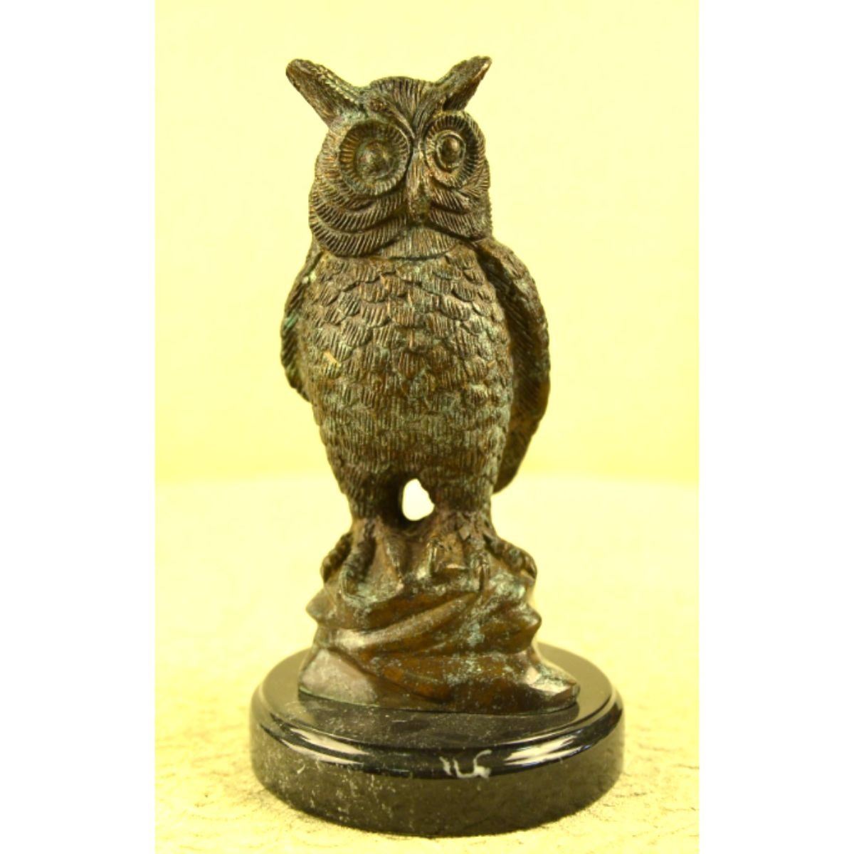 Perched Owl sculpture. Lost wax casting method bronze, with two toned brown patina, mounted on a marble base. 9 1/2" H X 5" W. 7lbs weight. Signed M. Nardini.
