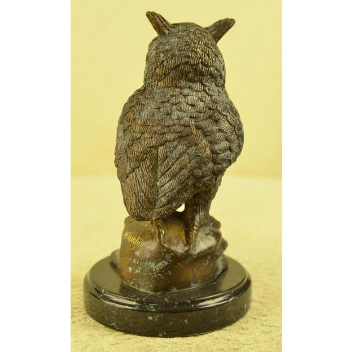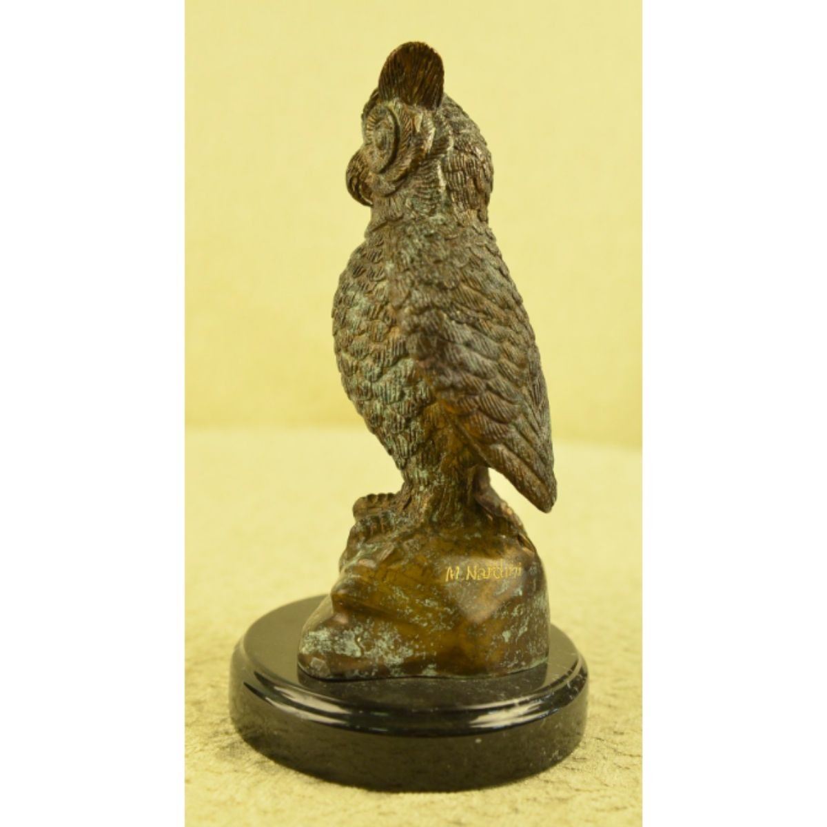 Perched Owl sculpture. Lost wax casting method bronze, with two toned brown patina, mounted on a marble base. 9 1/2" H X 5" W. 7lbs weight. Signed M. Nardini.