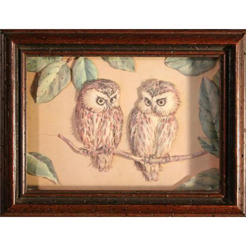 ?Perched Owls? is an incredibly unique creation by a very talented artist. This unusual paper collage was handmade, created by taking multiple copies of the same print and layering them strategically to make the image appear to be three-dimensional. The feathers of the owls come to life with tiny cuts creating wonderful texture and realism. The branch on which the birds are perched also appears to curve out from the flat surface creating the illusion that the owls are suspended in mid-air. The leaves around the perimeter of the piece have also been cut and layered to make them appear to be rustling in the breeze. The print is mounted in a shadowbox frame of medium brown wood which brings the total measurements to 8 ½? x 6 ½.? This is truly a one of a kind work of art that would be a charming and affordable addition to any collection.