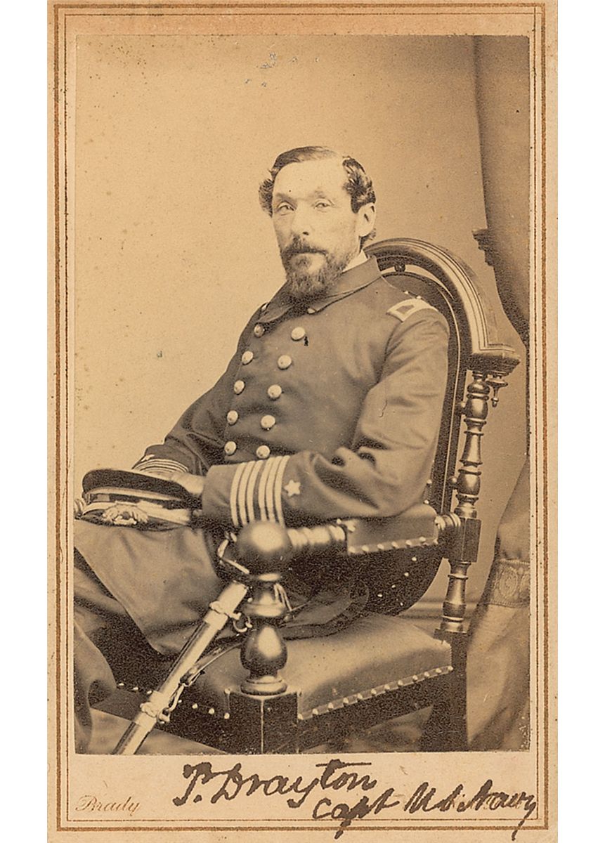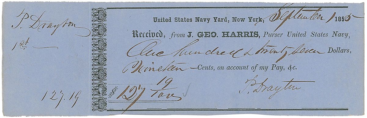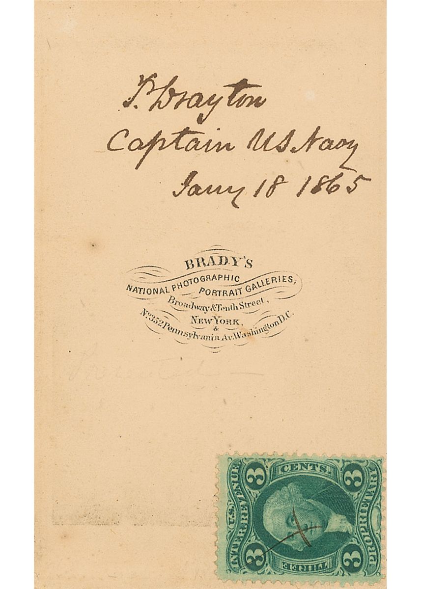 Union navy officer (1812–1865) who commanded naval forces against Confederate forts defended by his brother Thomas F. Drayton in the capture of Port Royal, South Carolina in 1861. Two items: one Civil War–dated original 2.5 x 4 carte-de-visite portrait of Drayton in uniform by Brady’s National Photographic Portrait Galleries of New York, signed in the lower border in black ink, “P. Drayton, Capt. US Navy,” and on the reverse, “P. Drayton, Captain US Navy, Jan’y 18, 1865”; and one partly-printed DS signed “P. Drayton,” one page, 8.25 x 2.5, September 1, 1865, a receipt for a payment of $127.19. In overall fine condition, with silvering to dark areas of the carte-de-visite image and a revenue stamp affixed to the reverse.
