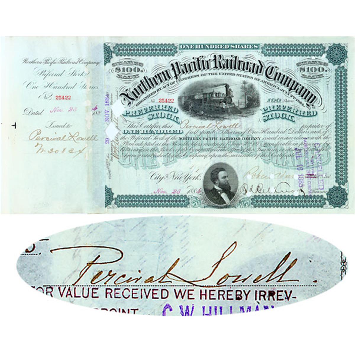 1884, Northern Pacific Railway Stock certificate for 100 shares issued to and signed the famous astonomer, Percival Lowell. Attractive certificate with ornate border, vignette of a train passing by telegraph lines in the countryside and a lower vignette of Fredrick Billings. Green/Black. Signed on verso: "Percival Lowell." PERCIVAL LOWELL: (1855-1916). Astronomer; founder the Lowell Observatory in Flagstaff, Arizona. Known especially for his interest in Mars and his theory of the 'canals' of Mars and predicted the existence of the planet Pluto. ***Punch hole cancellations not affecting signature. Very Fine.