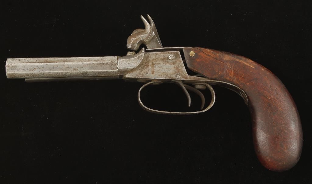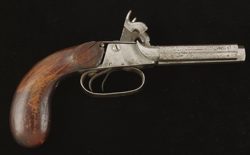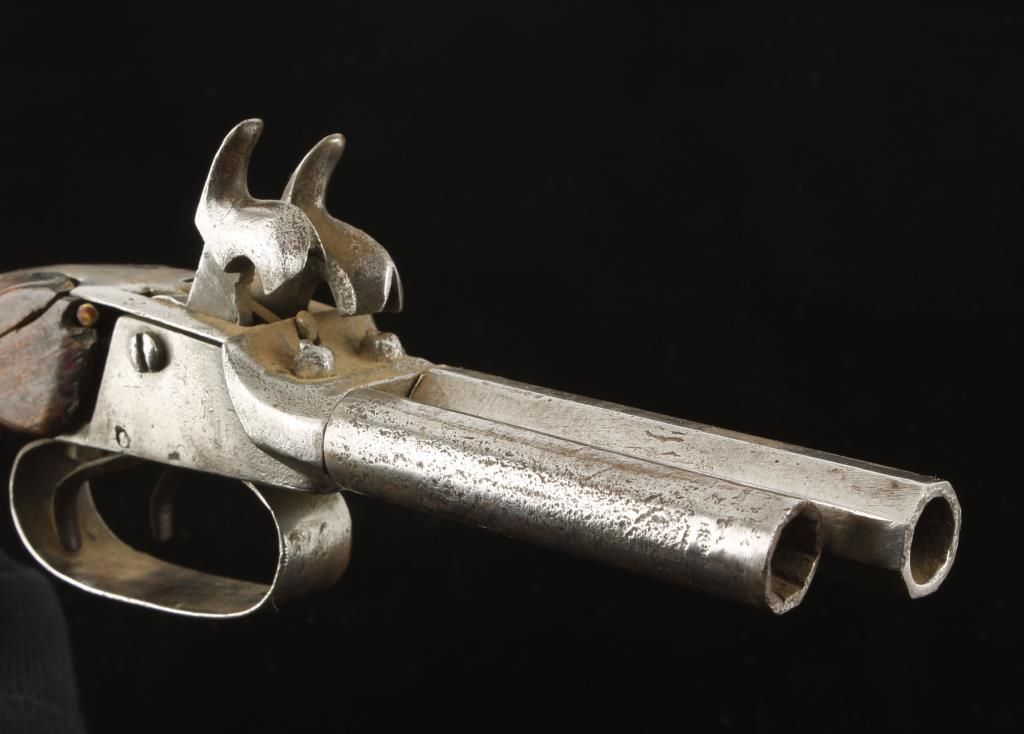 "Snake Eyes" percussion pistol circa 1850's-1860's. Fair condition with 1 barrel being replaced during use. Marked "EK" on trigger guard. Non working action.