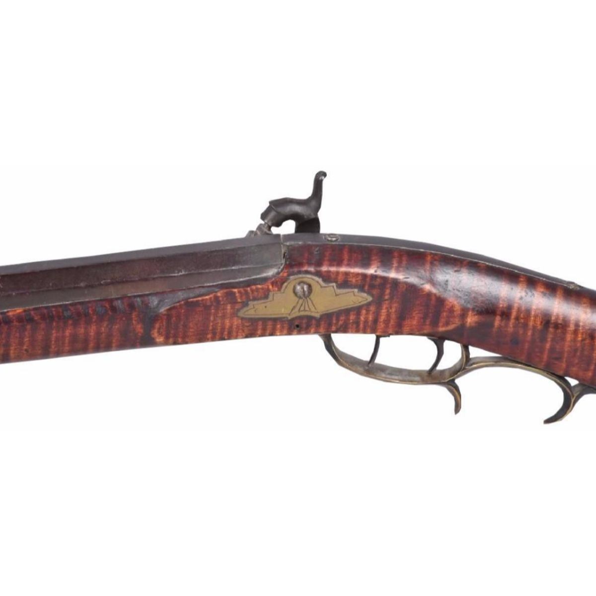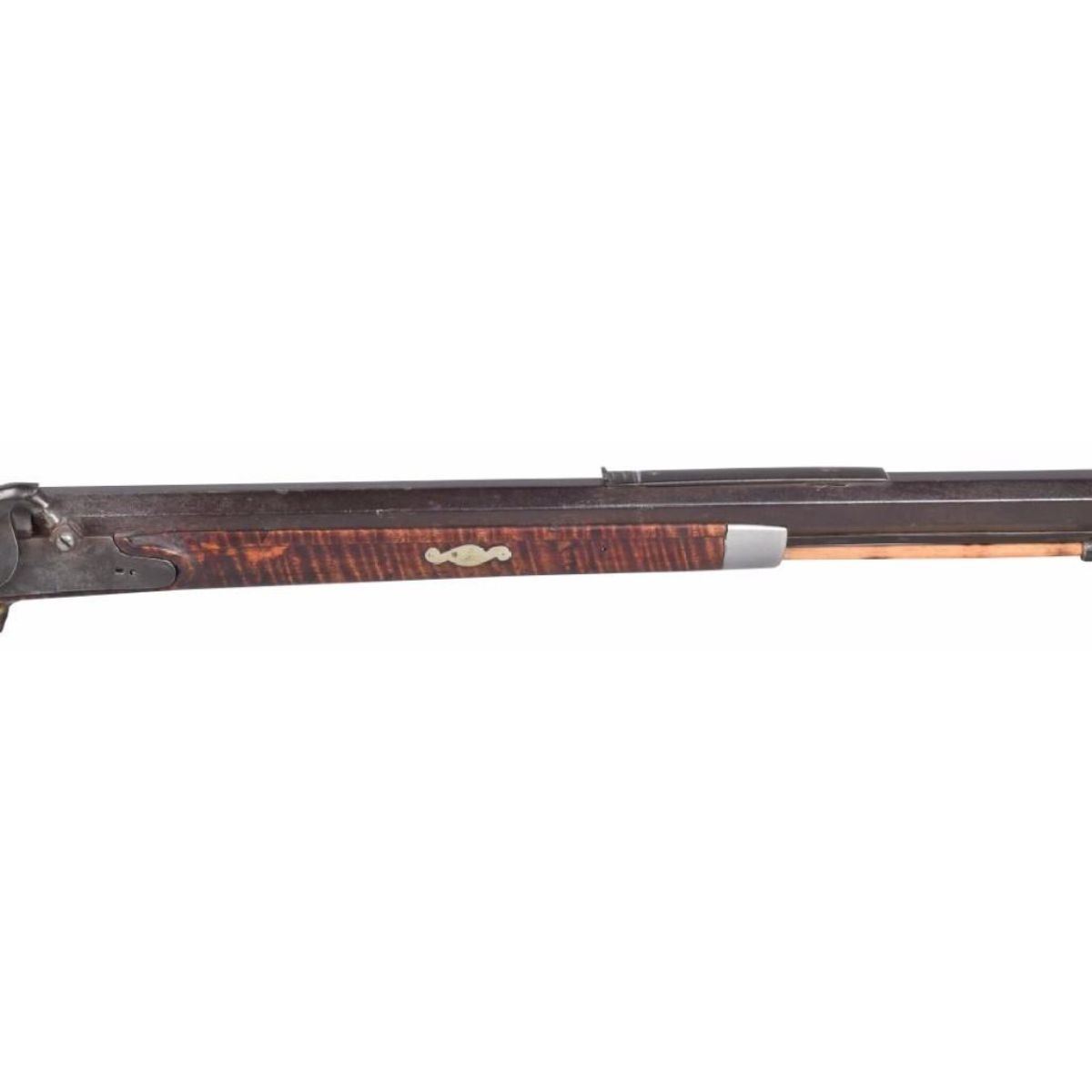 35 1/4" octagon barrel about .50 caliber. Tiger maple half stock with patch box. Action works and displays well. Very Good