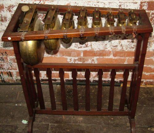 Xylophone type percussion 8-note instrument on wooden stand. Bars placed atop cow bells suspended and attached to frame with string. String has been replaced on one side of one bell. Measures approximately 26"W by 32" H.