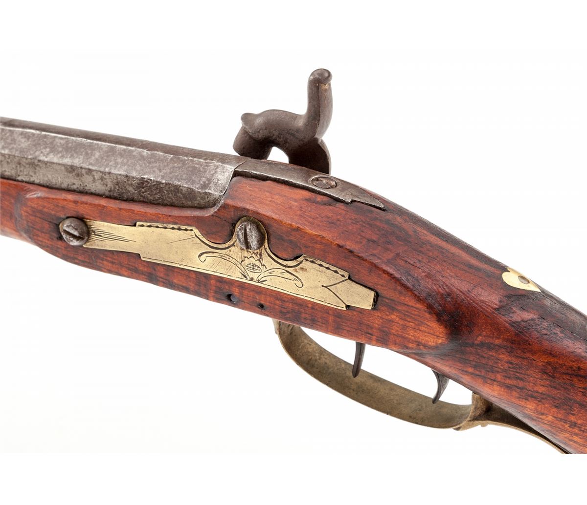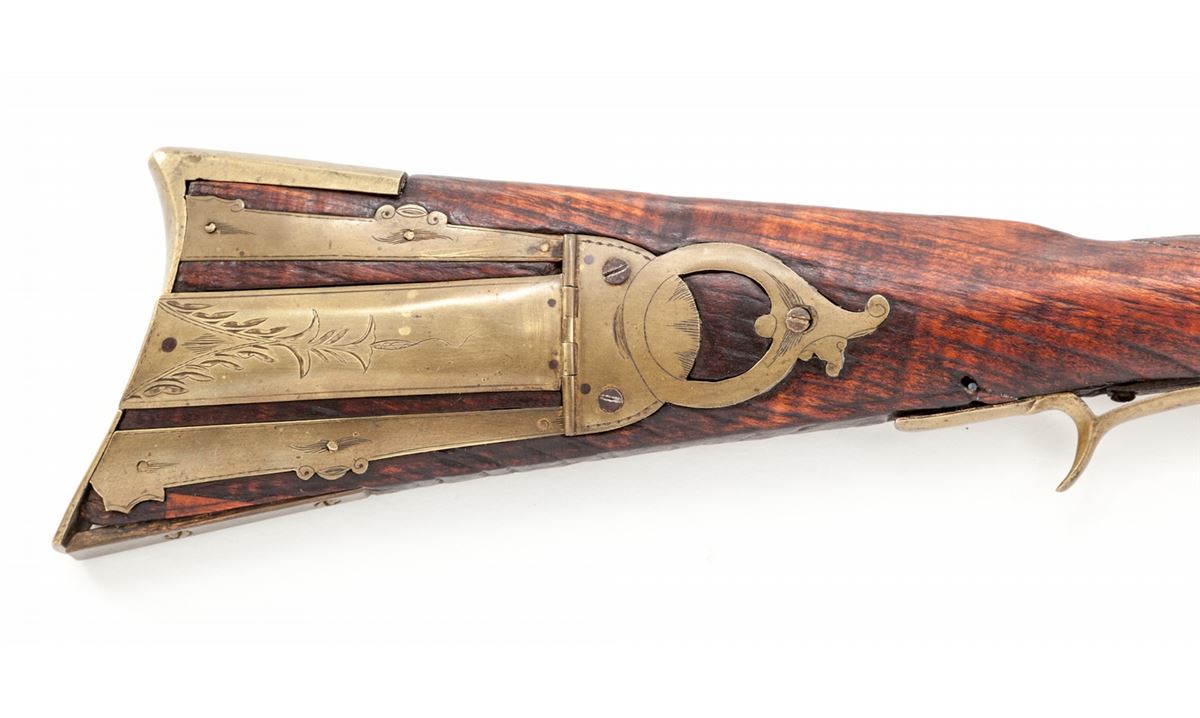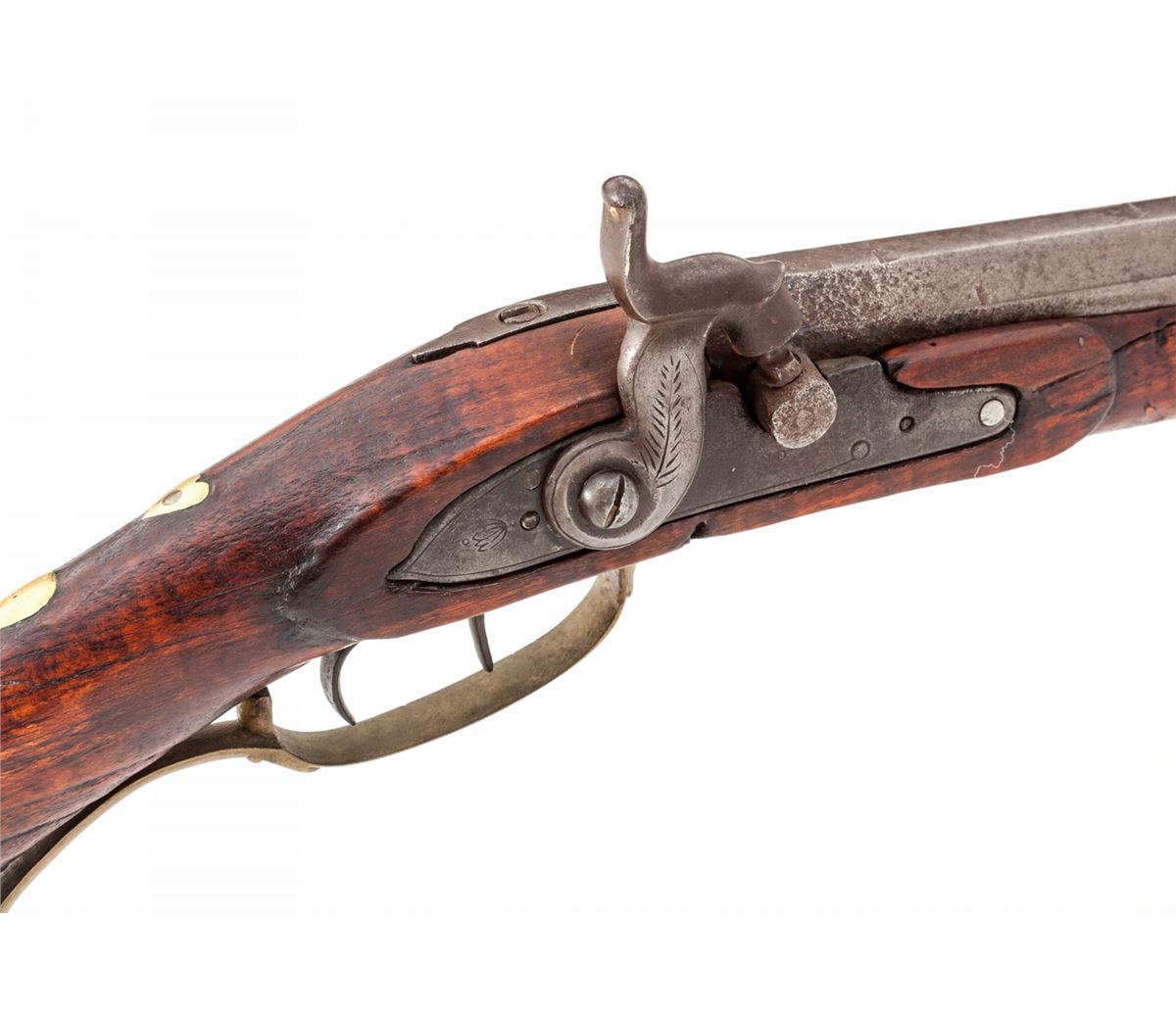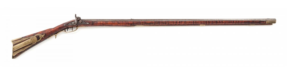 Percussion Kentucky Rifle, signed ''J. Yous'' in script, .45 cal. rifled bore, 43-1/2'' octagonal barrel, dual set triggers, full-length engraved sideplate, maple stock has the classic Bedford style patchbox with a ''Q'' finial and nice engraving. Condition is good overall. Stock has been heavily cleaned some time ago with some missing chips and several small wood silver replacements. Est.: $1,200-$1,500. (Antique)