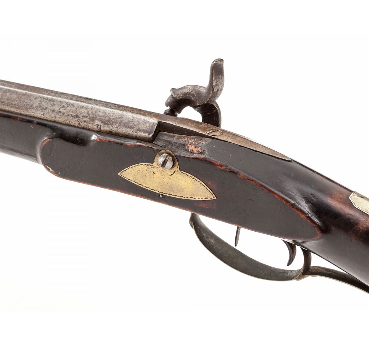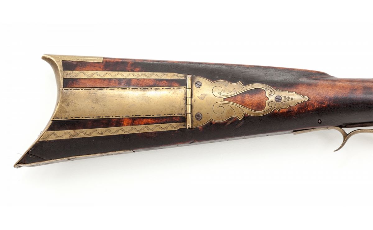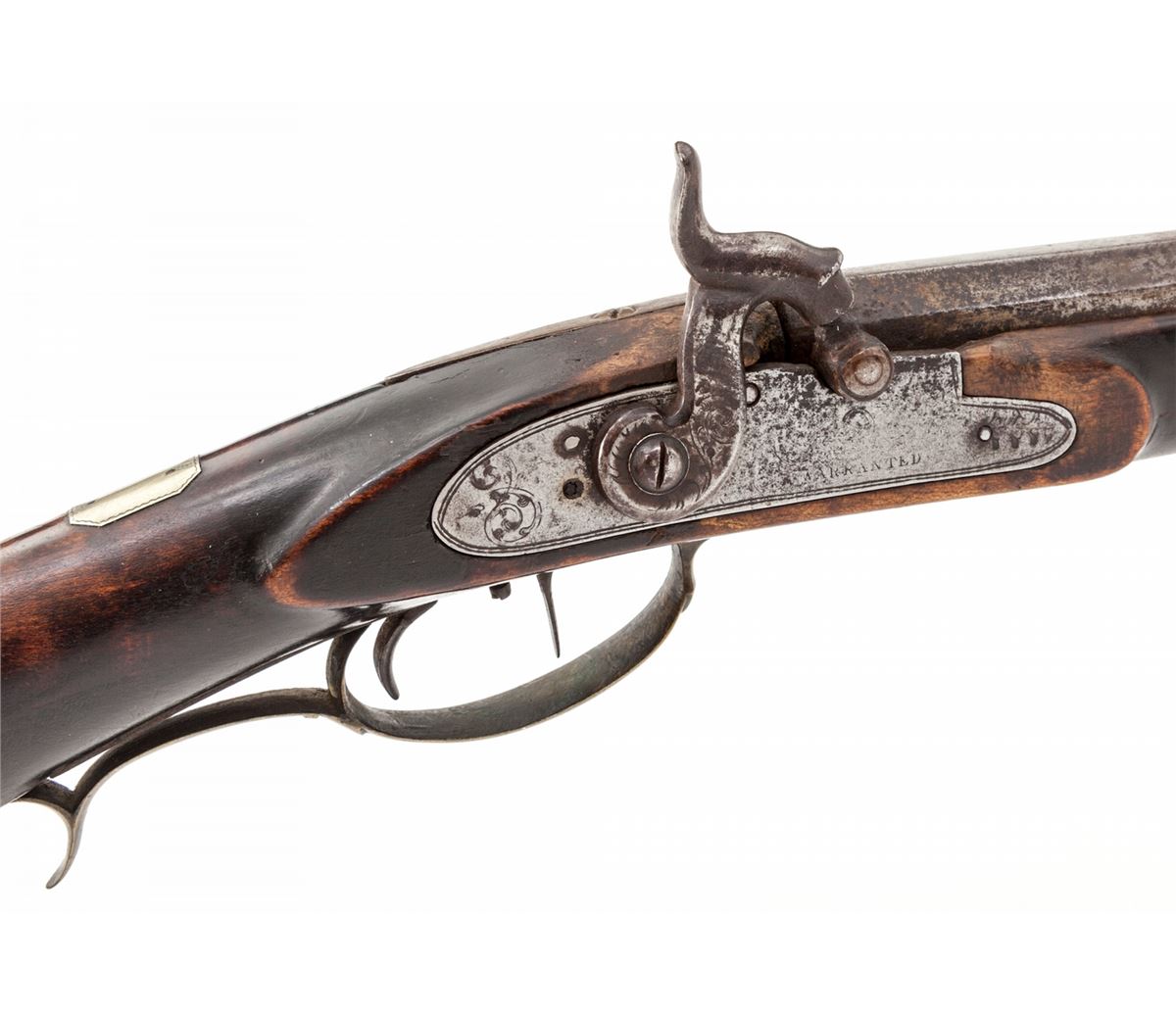 Percussion Kentucky Rifle, signed ''S. (Samuel) Small'', .38 cal. rifled bore, 40'' octagonal barrel, 55'' overall, mild curly maple stock retains 70% of its original dark stain which conceals the wood grain (a process used by many gunsmiths of that period); a rectangular silver escutcheon is on the wrist area, and the brass patchbox has one piercing and nice border engraving. Samuel was a gunsmith in New Lisbon, Ohio, during the first half of the 19th Century. Condition is very good with moderate wear and handling dings. Est.: $1,300-$1,800. (Antique)