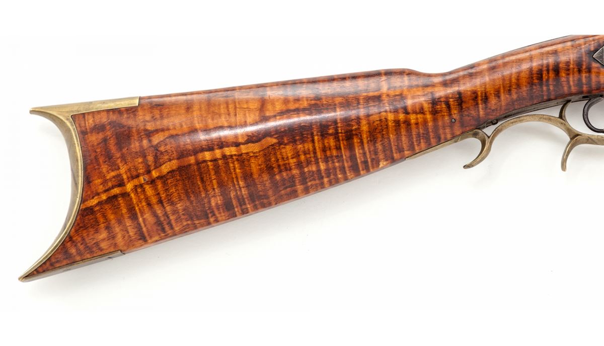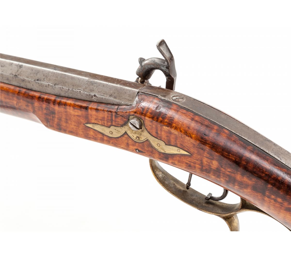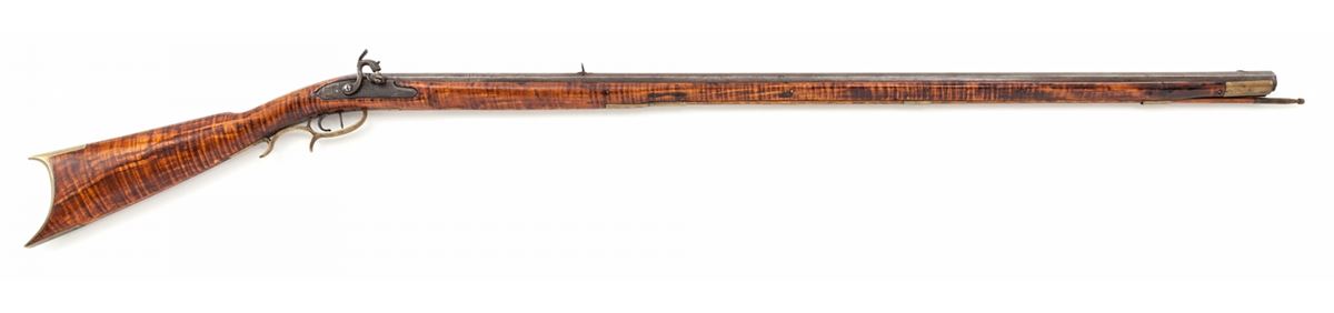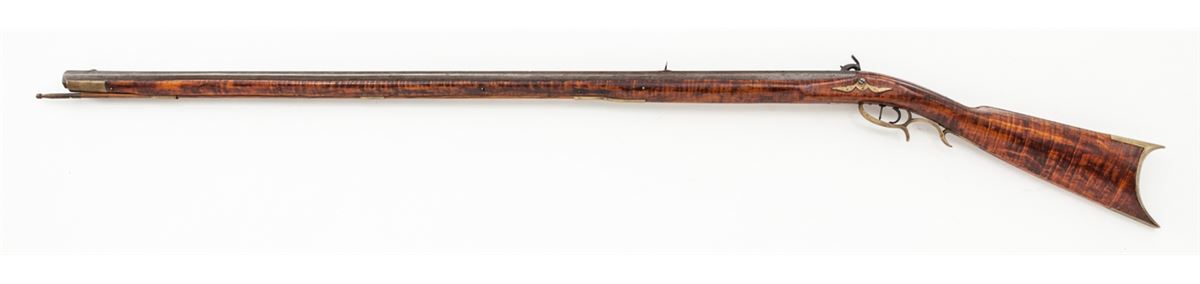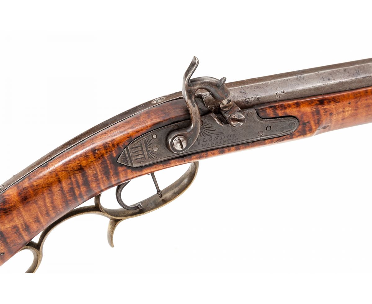 Percussion Kentucky Rifle, .44 cal. rifled bore, 43'' octagonal barrel, 58'' overall, nicely figured curly maple stock with brass mounts, and dual set triggers. The lockplate is marked ''London - Warranted'', with Bedford-Western Pennsylvania style hammer. Condition is very good. Est.: $700-$1,000. (Antique)