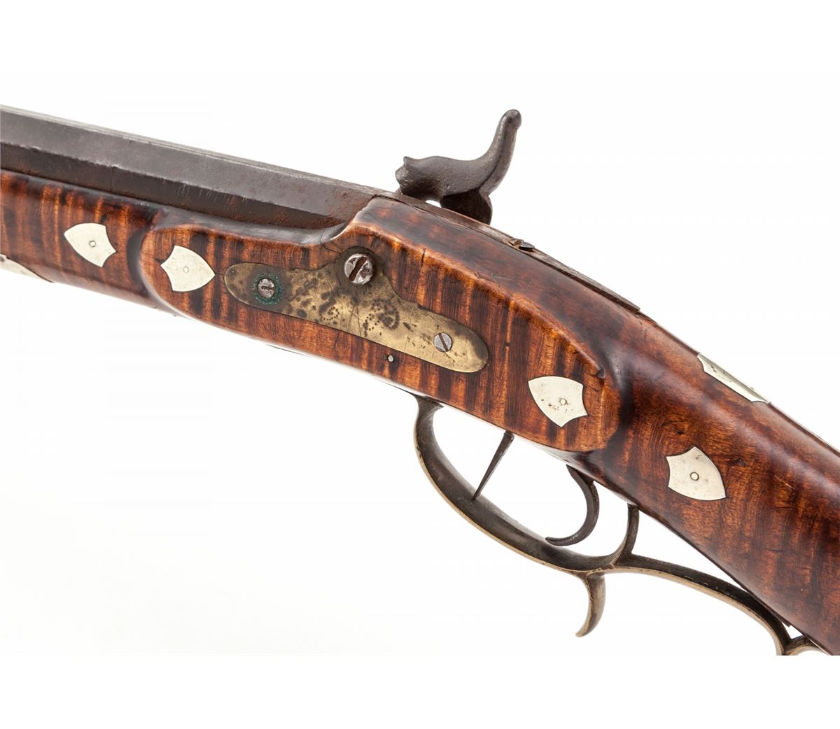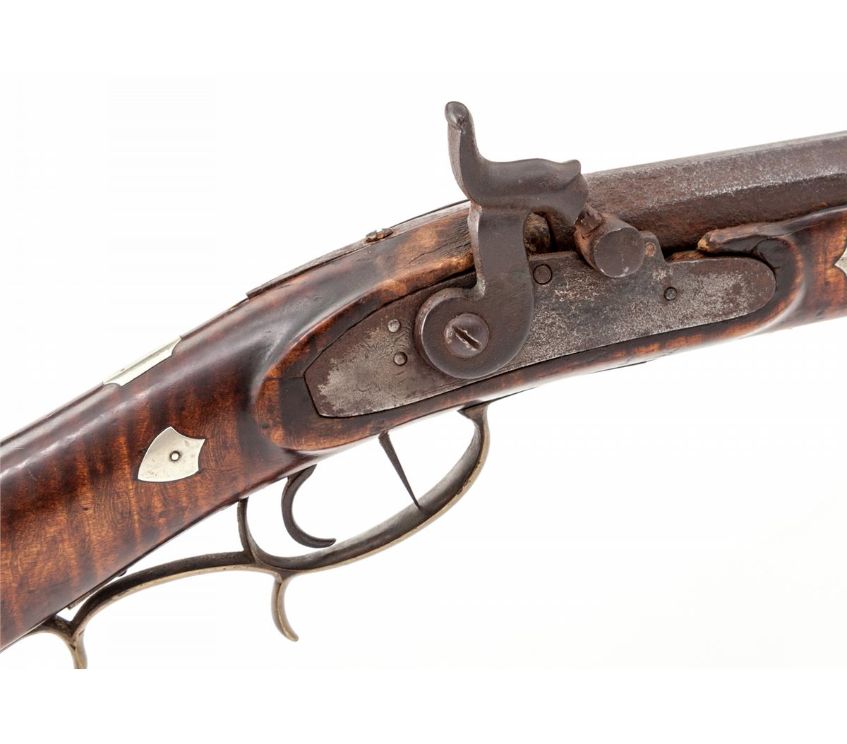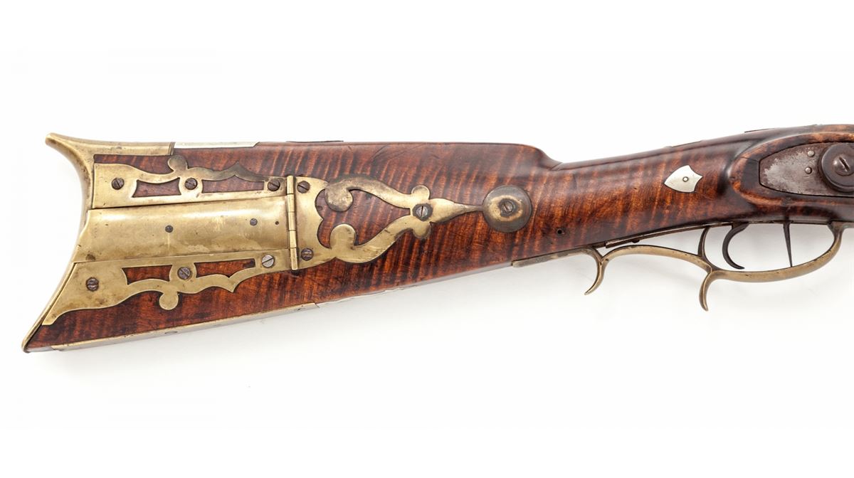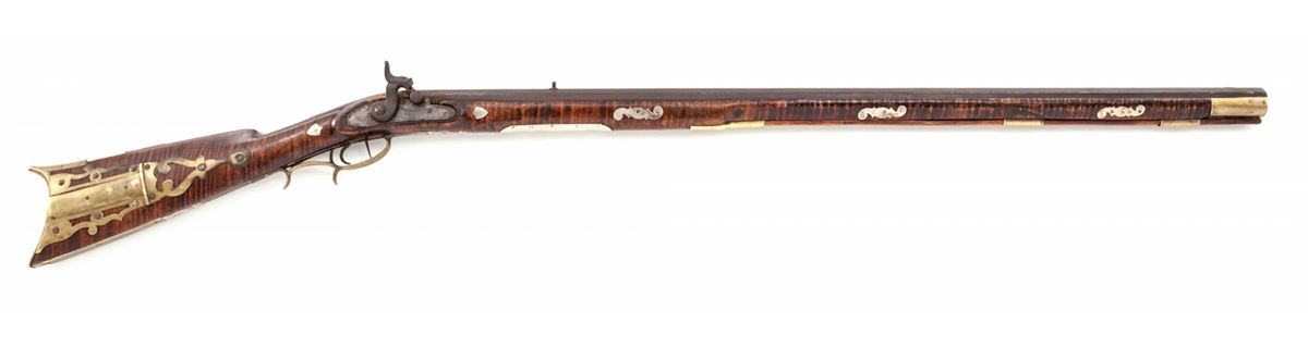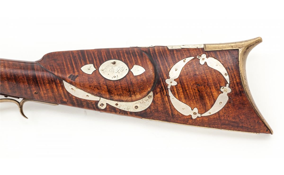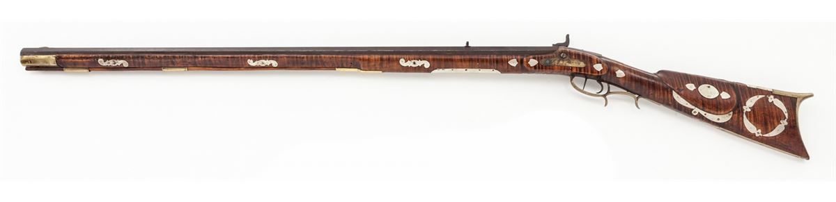 Percussion Kentucky Rifle, signed ''J.S.'' in script on top flate, .38 cal. rifled, 36'' octagonal barrel, dual set triggers, curly maple stock with nicely formed crescent cheekpiece on left side, and fancy brass patchbox with five piercings; there are 27 silver inlays of shields, ovals and other freeforms from end to end of stock. This Southern rifle is attributed to the Carolina region. Condition is very good overall. Approx. ¬'' of wood along top forward half of forend on both sides has been properly restored and barely visible. Est.: $2,000-$3,000. (Antique)