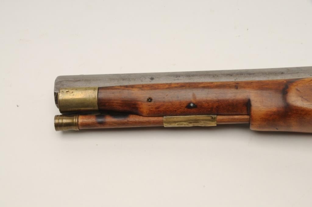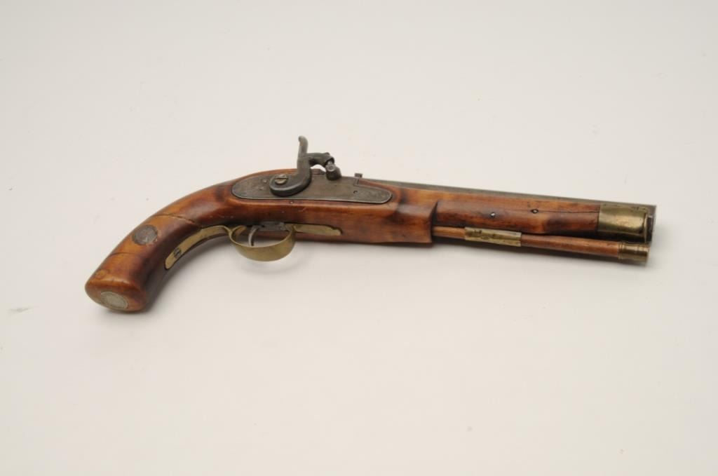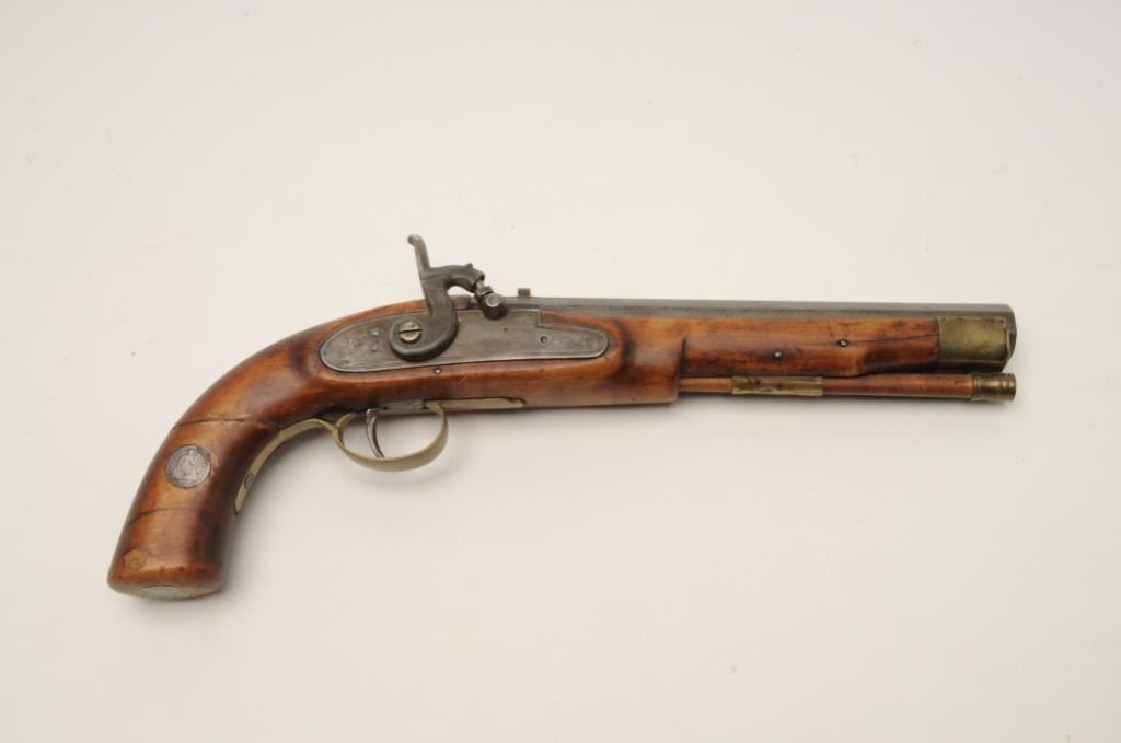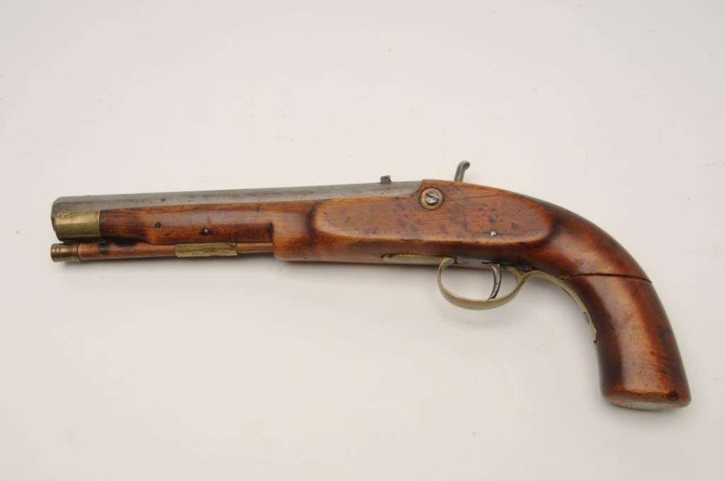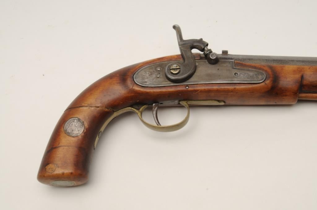 Percussion “Kentucky” style pistol marked on lock “Parker warranted”. Somewhat crude and rural American style with barrel and lock utilized from rifle parts. 1842 U.S. silver coin inlaid into the stock. Measures 15 ¼”overall with a 9” octagon barrel of .46 to .48 caliber rifle measuring almost ¾” across to outside dimensions. Fair to good condition with natural metal patina. The stock is broken and shows a light old refinish.(Antique) Est.: $500-$1000