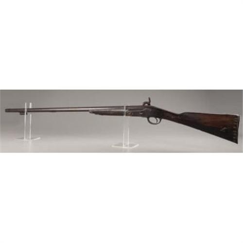 <B>PERCUSSION MUSKET</B></I> - Approximately .60 caliber with round barrel. Circa 1860s or so. No visible markings on barrel or lockplate. Forestock shortened to mid-barrel length with lead cap added. Three small silver diamond-shape inlays in various locations on stock along with a small quarter moon inlay. Brass trigger guard and butt plate. Brass tacks decorate both sides of the butt stock.<BR><BR><B>Condition:</B></I> Metal surfaces uniformly pitted. Wood shows quite a bit of wear, but is basically sound. Missing ramrod and trigger guard swivel.<BR><BR><b>Shipping:</b> Bats, Clubs, Sticks, Swords, Rif (<a target="_blank" href="http://www.heritageauctions.com/common/shipping.php">view shipping information</a>)