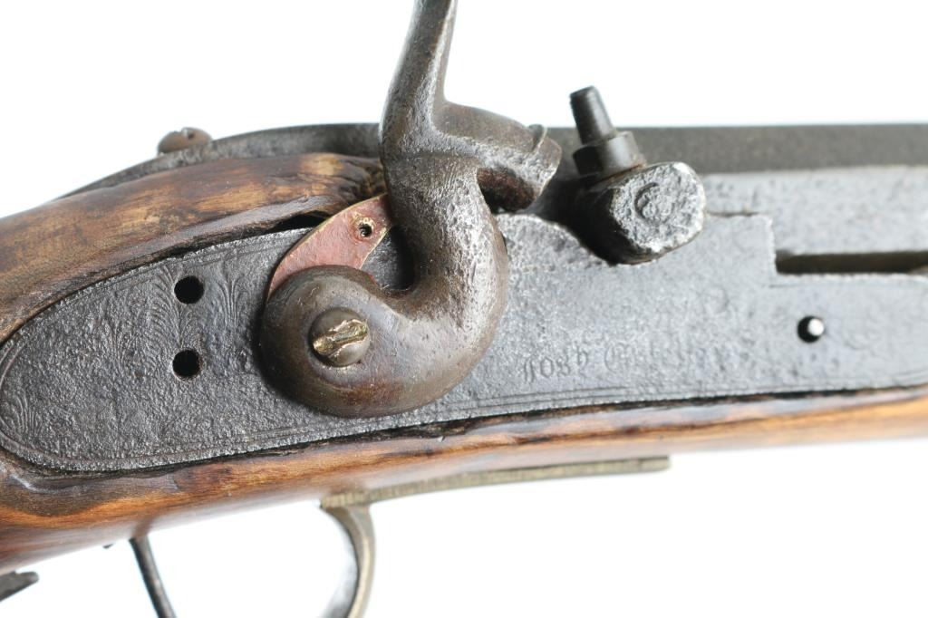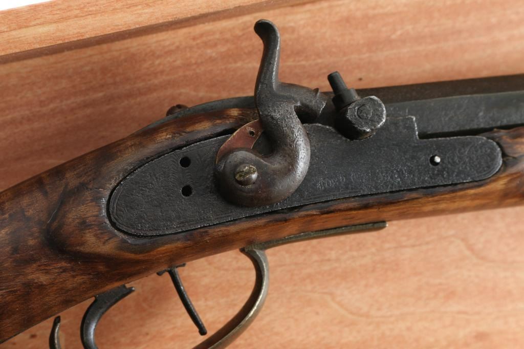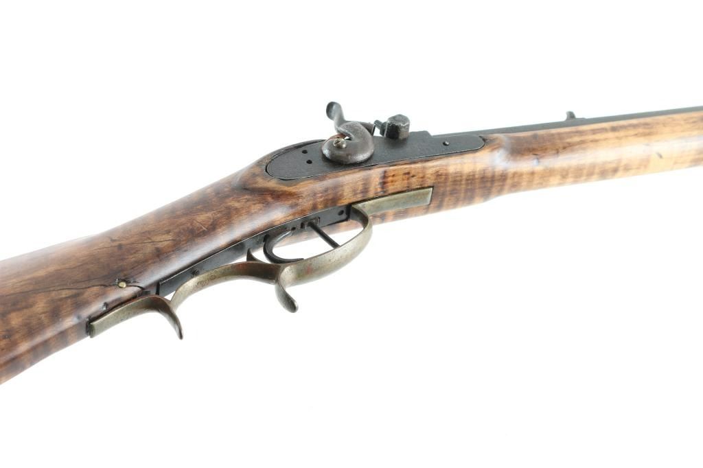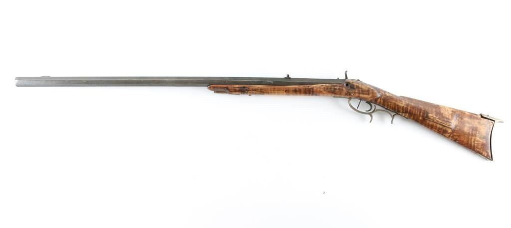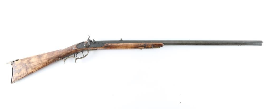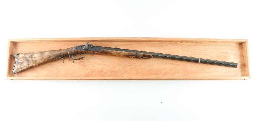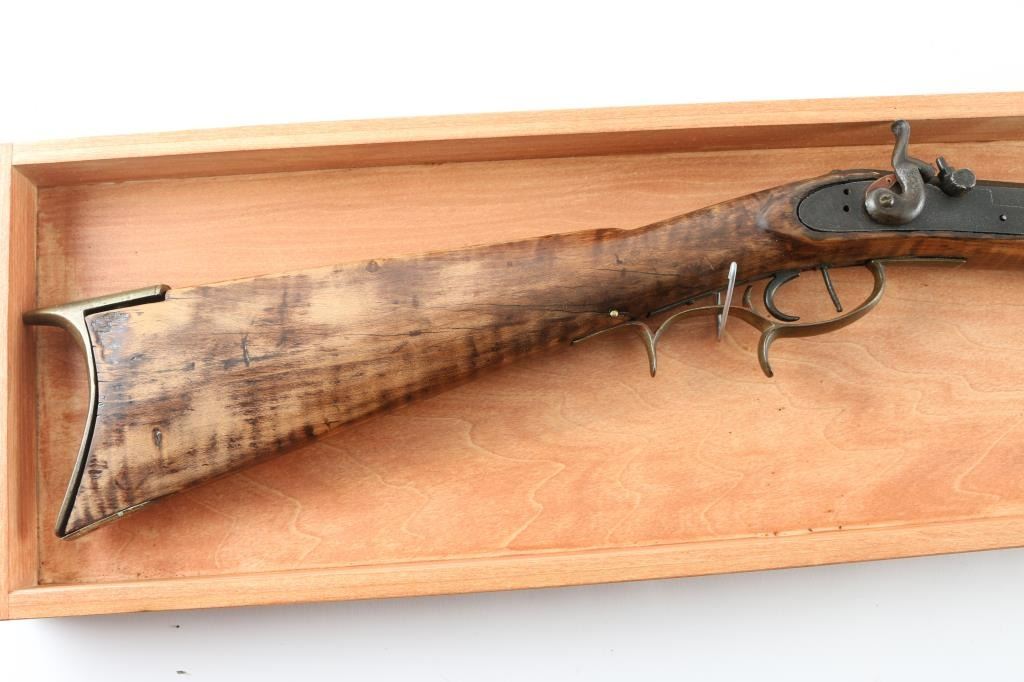 consisting of a wood frame holding a much used vintage rifle, approx 40 cal. Features 30" octagon barrel, blade front and notch rear sights in dovetails, right hand lock, wood half stock with right hand cheek piece, brass fittings, crescent butt, double set triggers. Metal is slightly rough textured from small pits throughout, now showing a brownish gray color. Some markings on lock plate are visible thru the pitting and erosion but are difficult to read. Wood is distressed, with erosion and cracks, sanded, shows tiger stripe pattern. Ram rod missing. Butt plate is loose, with poor fit. Bore not inspected. Action does not work properly, hammer is too short and does not reach nipple. Missing small parts, such as serpentine. Condition is NRA Poor *** Antique Firearm ***