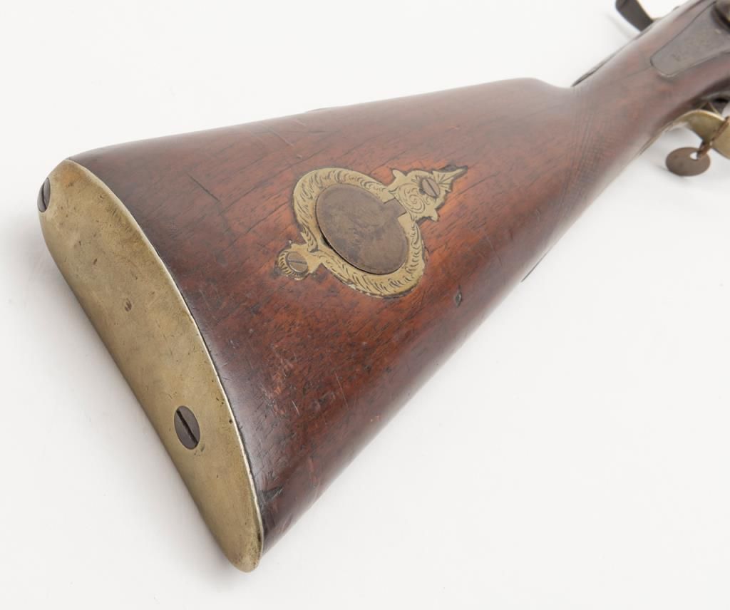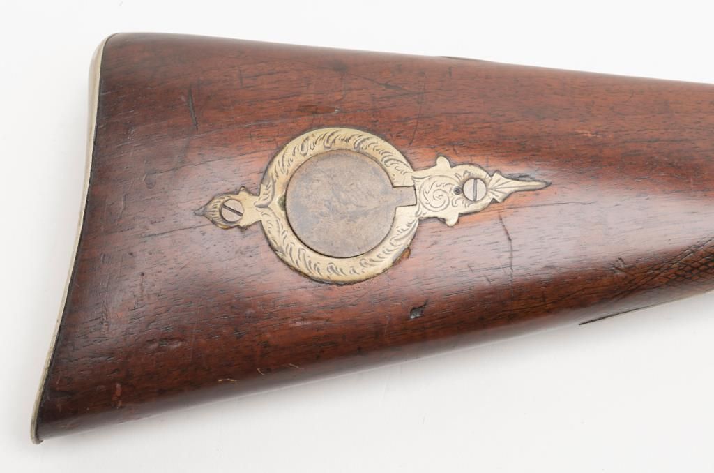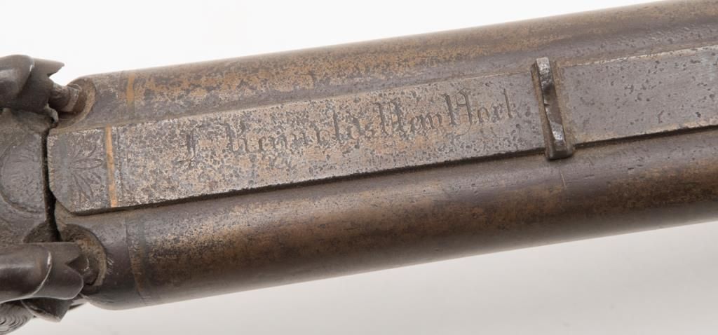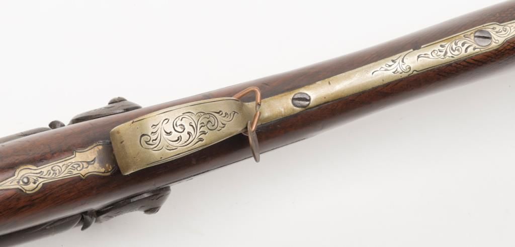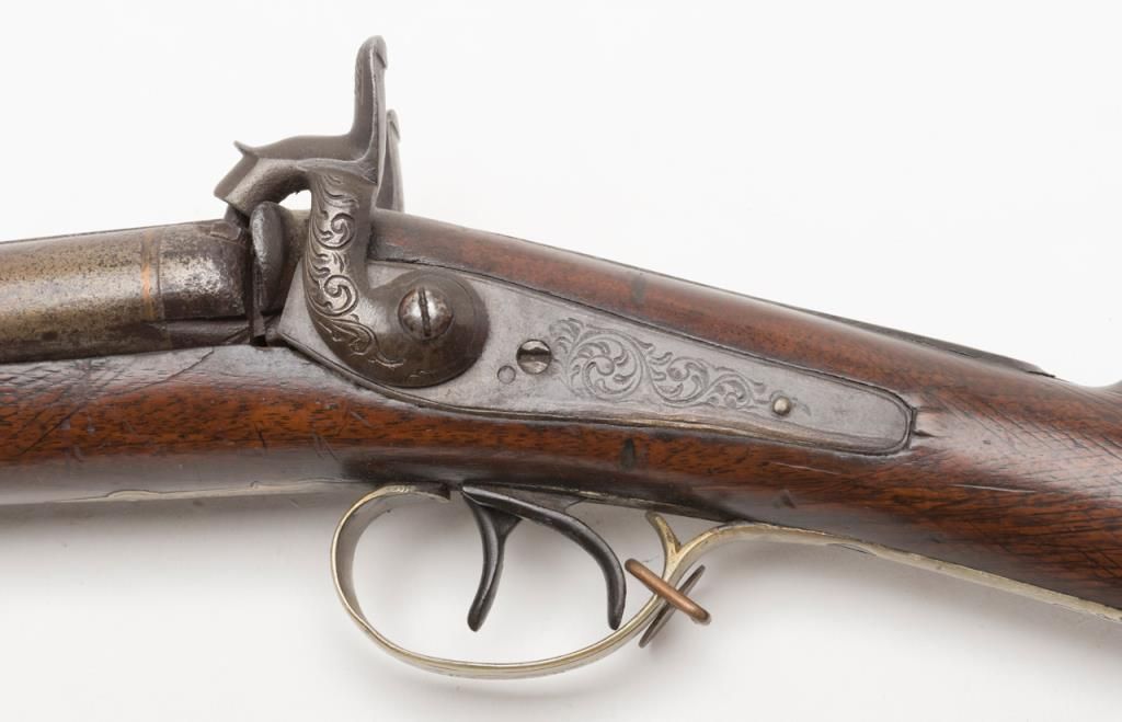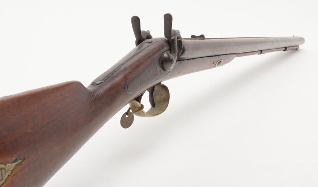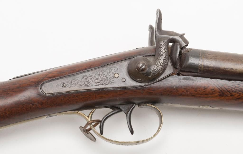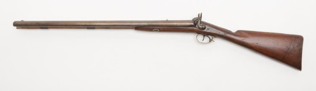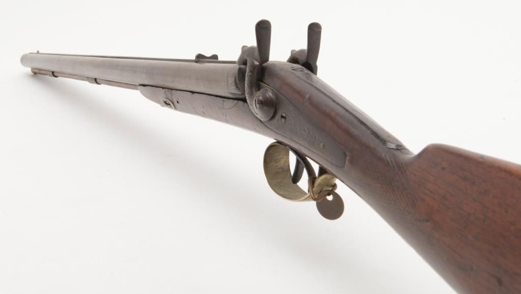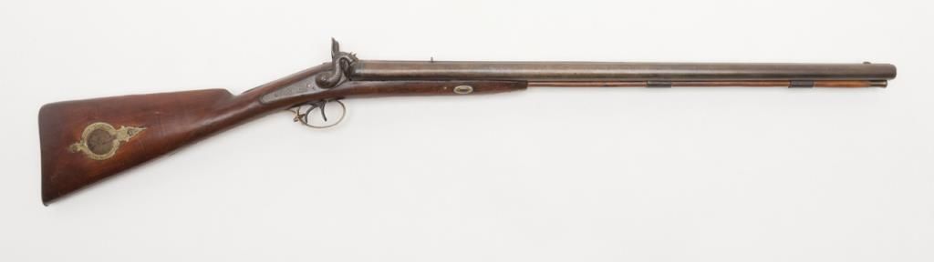 Percussion SxS back action lock “buck and ball” rifle, 28 gauge/.52 cal., 27” barrels, double triggers, checkered half stock, round patchbox, percussion cap compartment on top of butt stock, brass tipped ramrod. This gun is in overall goodcondition showing a dark patina to metal surfaces, good actions, dark bores, wood is worn and shows an old re-varnish; single keyed with an old crack on the underside of the forend; an old collection or museum copper disc numbered 592 is attached tothe trigger guard. (Antique). Est.: $175-$275.