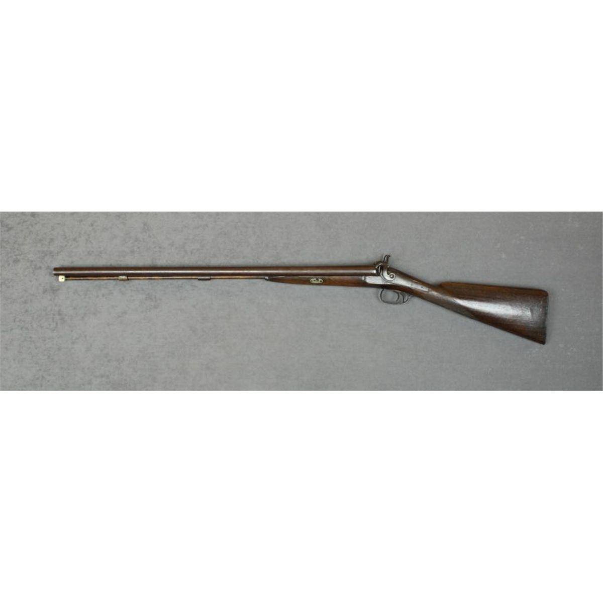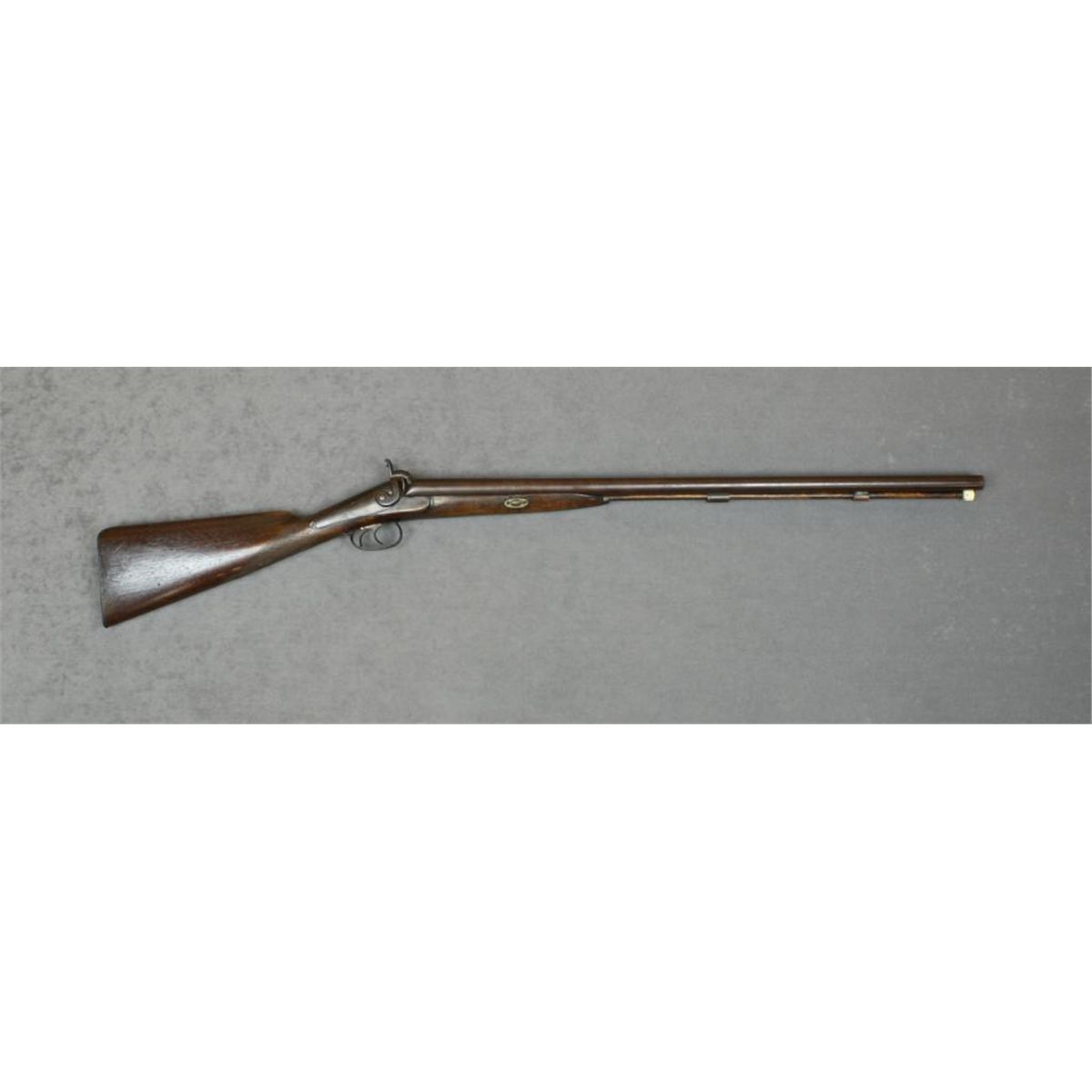 Percussion SxS shotgun, back action locks, 12 gauge, 30” barrels, brown finish, checkered wood half stock with iron butt plate. This gun is in overall good condition showing an untouched heavy patina on metal and woodsurfaces, no maker’s markings except the initials “S. J.” on the breech end of the barrel and behind the trigger guard; dark bores, good actions, overall good wood showing some scattered mars and scratchesfrom carry and storage; wood cleaning rod. Est.: $300-$500.