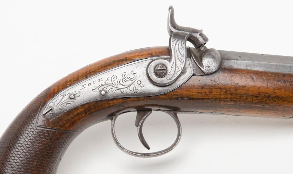Percussion belt pistol signed “Nock London”, large bore, circa 1850’s-60’s in good original condition measuring approx. 11” overall with a 6” octagon barrel of approx. .65 caliber smoothbore, full stocked to the muzzle, measuring nearly1-1/8” across the flats of the muzzle. The metal surfaces show a light grey to brown patina and just normal aging; the varnished wood stock is good to very good with just some minor cracks, wear to the checkering and approx. 70% varnishremaining. The trigger guard shows some pitting from moisture; the markings are good, the edges are good, the breech shows two silver bands. A wooden ramrod of a later date is included. Nock was a high quality London maker who was known forall types of high quality arms including volley guns and blunderbusses. (Antique). Est.: $500-$1,000