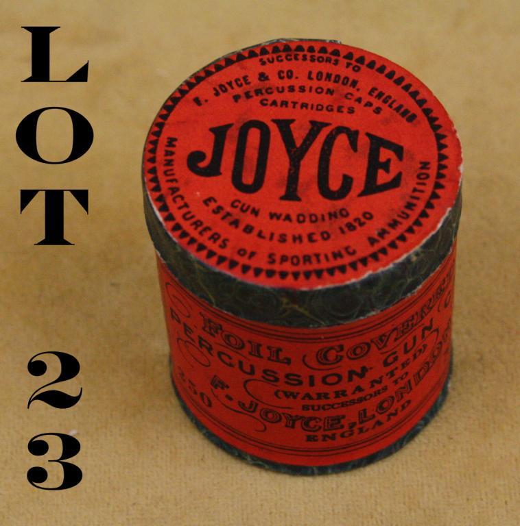 Percussion cap tin by Joyce & Co., London, England in overall very good condition showing the majority of the paper cover on both the lid and body of the tin. Est.: $50-$100.
