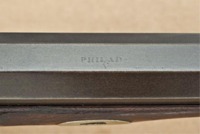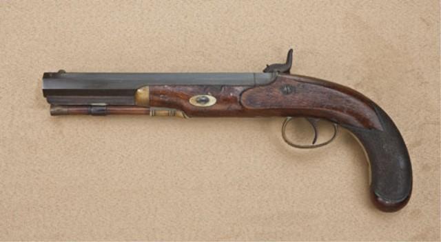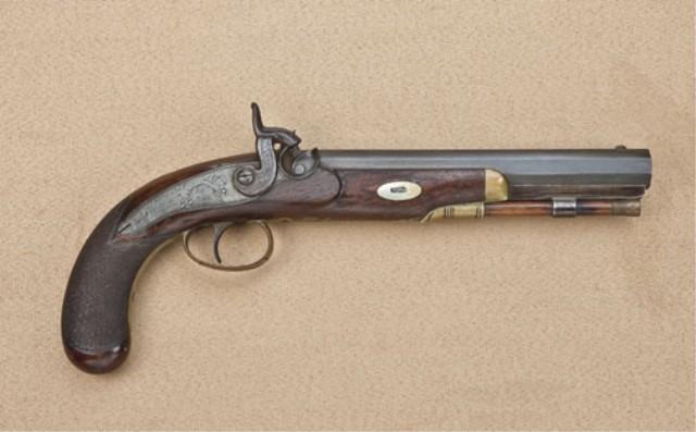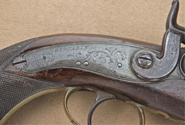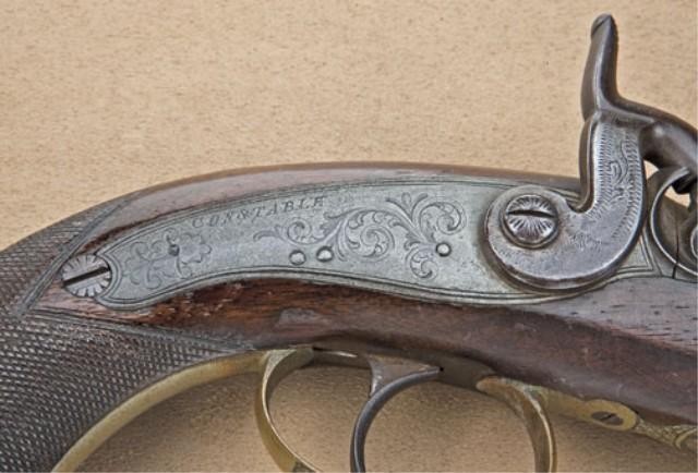 Percussion dueling pistol signed Constable, Philadelphia, circa 1850’s to 60’s. 14” overall, with 8-1/2” heavy octagon barrel, approx. 48 caliber, half stocked, brass engraved mounts, checkered bag-shaped butt. The barrel shows a deep brown patina finish and the lock shows a light silver drifting to patina. The stock shows two large chips of wood missing above the barrel key on the left side, a few gouges, some small dings and mars, and is generally fair to good. The mounts and triggerguard show a deep patina, the action is good, generally good overall. With an original to the period ramrod. A very well-known and desirable maker. From the William R. Orbelo Collection. Est: $1,500 - $3,000