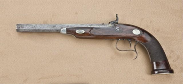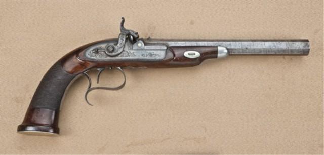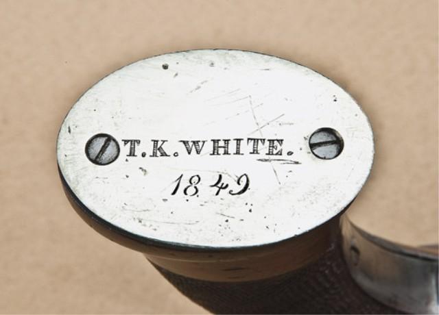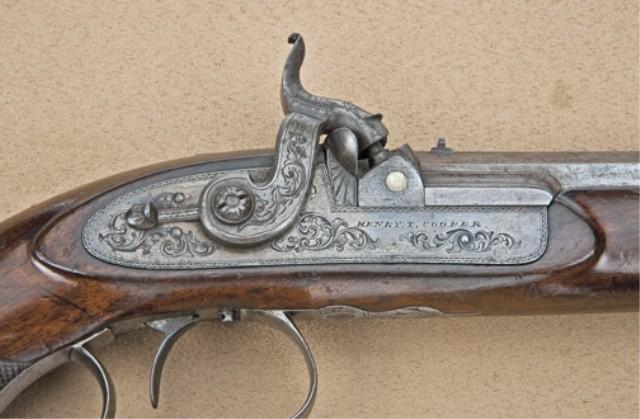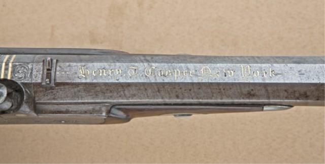 Percussion dueling/target pistol by Henry T. Cooper, New York. .52 caliber smoothbore. 9-1/2” medium weight octagon barrel, engraved iron triggerguard, German silver buttcap period inscribed in block letters T. K. White, 1849. The barrel is nicely gold inlaid with full maker’s name and New York. And is double gold banded at the breech and shows a v-notch rear sight and a post front sight. The lock is nicely engraved and also signed Henry T. Cooper. The gun is stocked in good quality walnut nicely checkered at the grip. The metal surfaces are good with some erosion and pinprick pitting, traces of original striping on barrel. Lock shows some case hardening drifting to silvery grey. The stock is good to very good crisp checkering, minor storage marks, and slight imperfections. The action is good, generally good overall. Would be interesting to research the identity of T. K. White, and the year 1849 is significant as the beginning of the gold rush. From the William R. Orbelo Collection. Est: $1,500 - $3,000