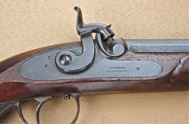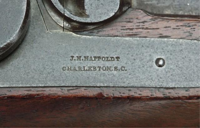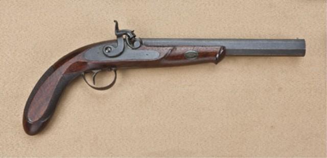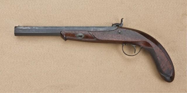 Percussion dueling/target pistol signed “J.H. Happoldt, Charleston South Carolina” on lock. .45 caliber smoothbore. Medium to heavyweight barrel, measuring 7/8” across barrel flats. Octagon is 8-3/4” in length 15-3/8” overall. Brown patina finish with traces of original brown on barrel and traces of good strong case hardening on lock. Simple iron triggerguard, single set trigger, silver barrel key escutcheons and silver shield at wrist. Pistol is nicely stocked in select walnut. Nicely checkered with flattened sides and distinctive Happoldt border. The stocks are in very good plus condition with just some minor scratches, marks, and minor handling. The action is crisp. There has been a small amount of cleaning on the left side of the barrel leaving a lighter colored area. Happoldt family worked in Charleston, South Carolina and their pistols are actively sought by southern arms collectors, and about a dozen are known. From the William R. Orbelo Collection. Est: $2,500 - $5,000