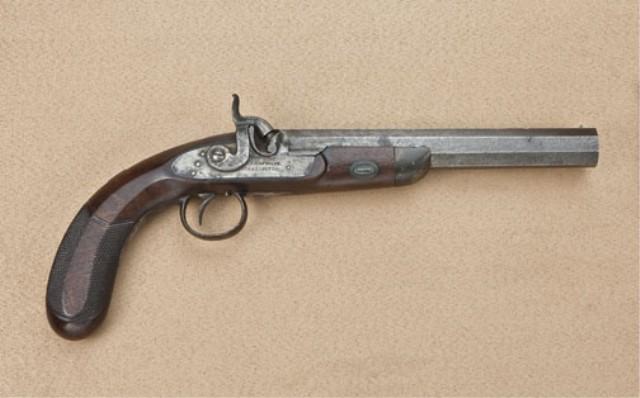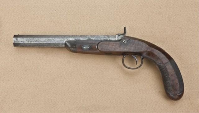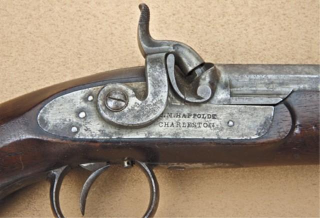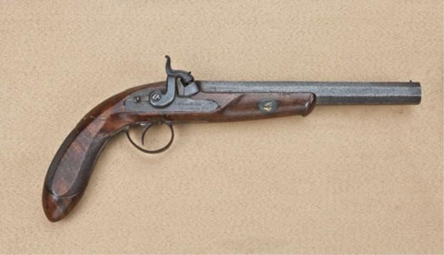 Percussion dueling/target pistol signed “J.M. Happoldt, Charleston” on lock. 8-1/2” heavy octagon barrel. Measuring nearly 1” across flats of muzzle. .36 caliber smoothbore. 14-1/2” overall. Half-stocked, plain iron triggerguard, adjustable set trigger. Single platinum band at breech. The pistols are stocks in good quality figured walnut, checkered in Happoldt’s design with flattened sides and course checkering with distinctive border. The pistol shows silver escutcheon keys and meticulous quality this maker was noted for. The metal surfaces are good and show slight to moderate erosion and pinprick pitting. Traces of case hardening at the breech. Stocks are very good with a mark at the lock screw from being scored, A couple of compression cracks, small marks, and minor imperfections. The action is crisp, and the pistol points beautifully. The wrist is engraved with a silver owner’s plaque. The Happoldt family worked in Charleston, South Carolina and their pistols are actively sought by southern arms collectors, and about a dozen are known. From the William R. Orbelo Collection. Est: $3,000 - $6,000
