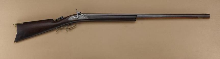Percussion half-stock plains rifle with Goulcher lock, made for blackpowder shooting before reproductions became available, 1900 to 1950’s. 31” medium weight octagon barrel, 41-1/2” overall, approx. .36 caliber. Folding tang sight, Lyman type, double set triggers, very good condition. Would make a good shooter and shows some good quality hand work. Est: $200 - $400